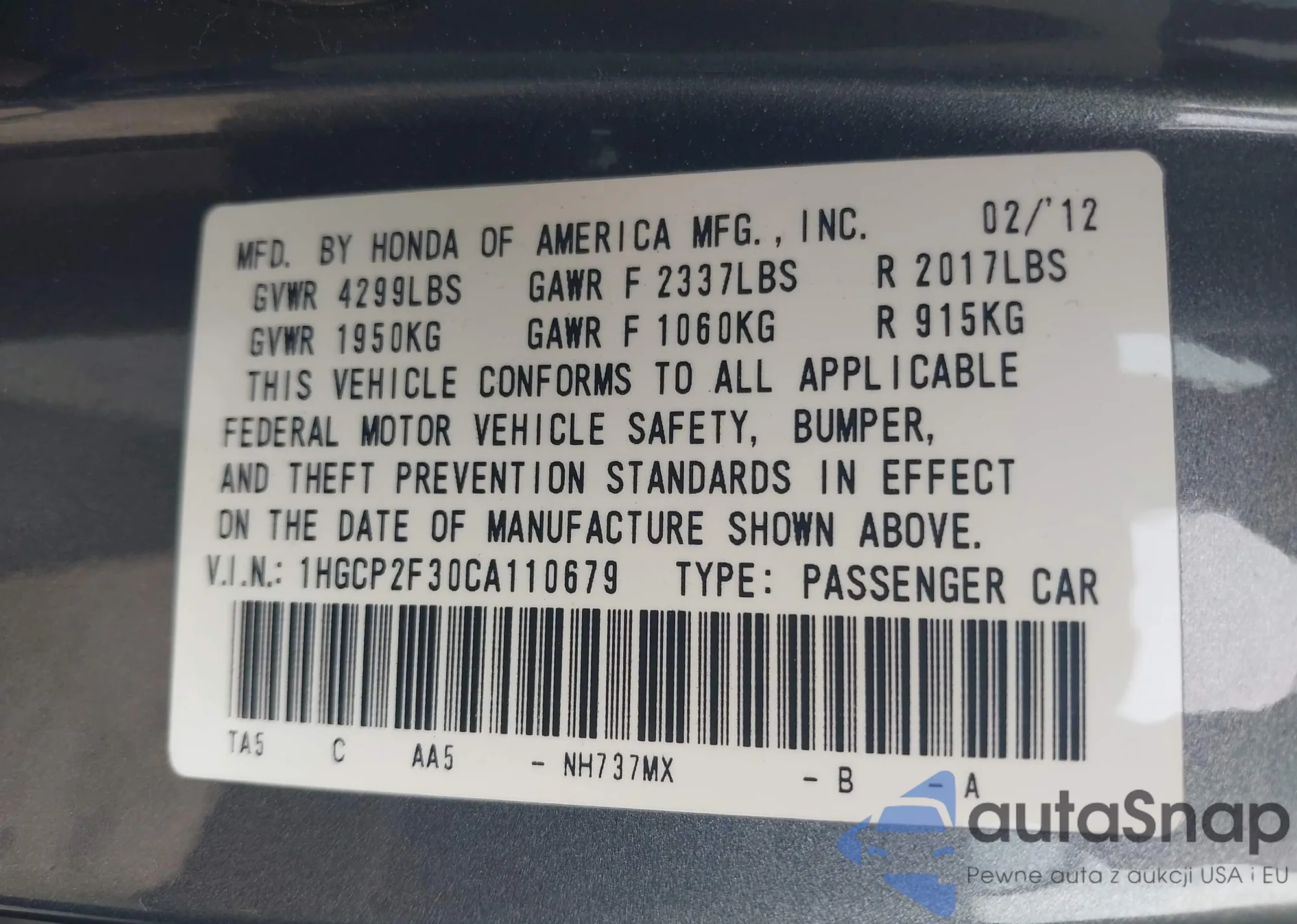 • VIN 1HGCP2F30CA110679
