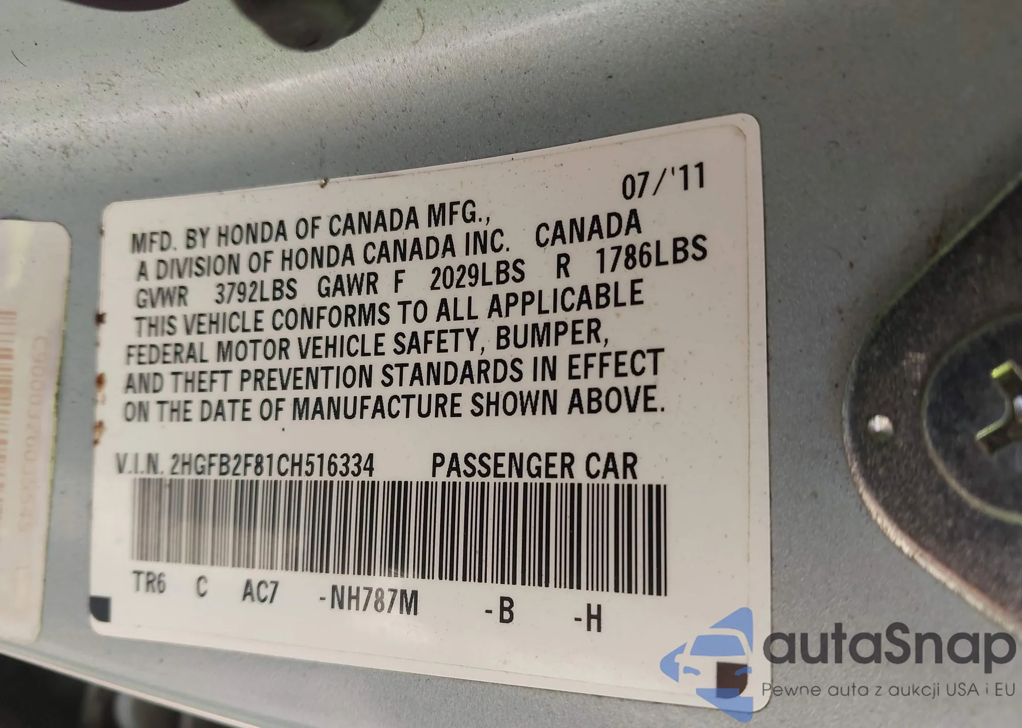 • VIN 2HGFB2F81CH516334