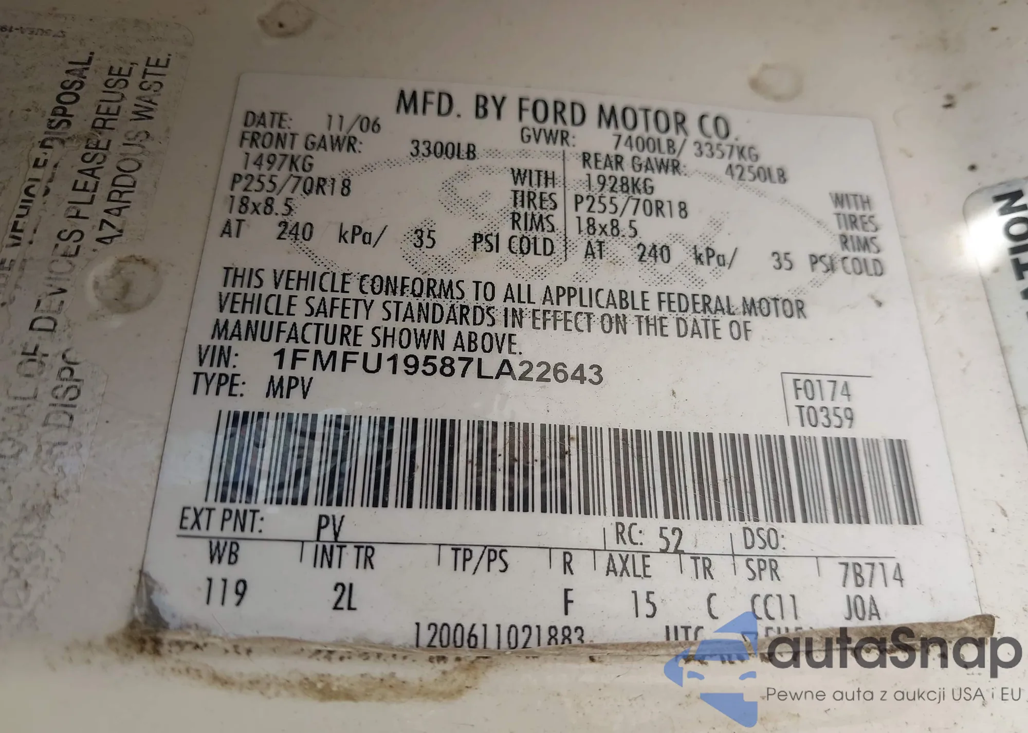 LOT: 42483405 VIN: 1FMFU19587LA22643