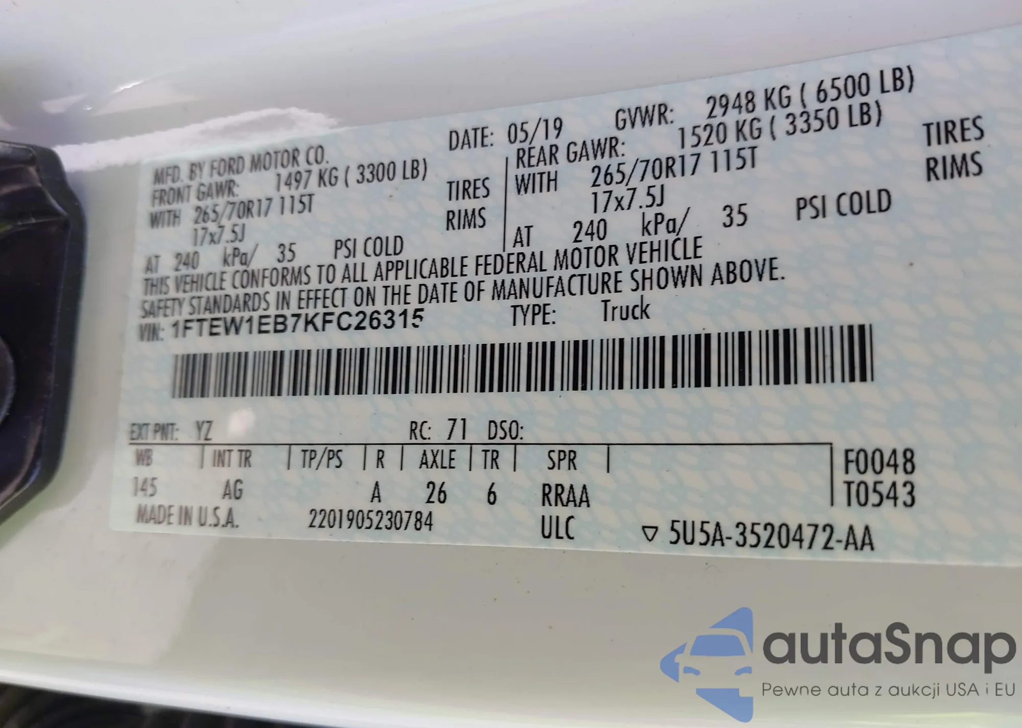 • VIN 1FTEW1EB7KFC26315