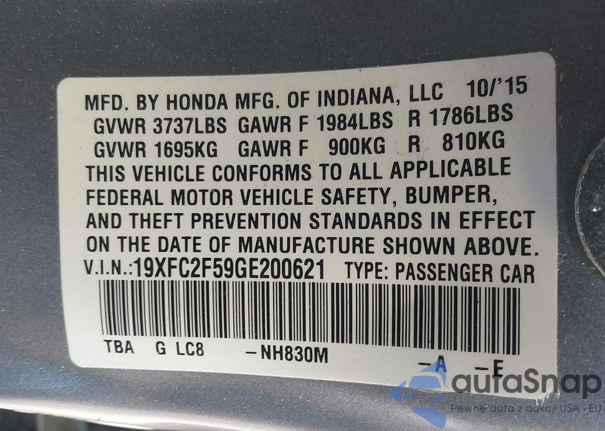 LOT: 42166466 VIN: 19XFC2F59GE200621