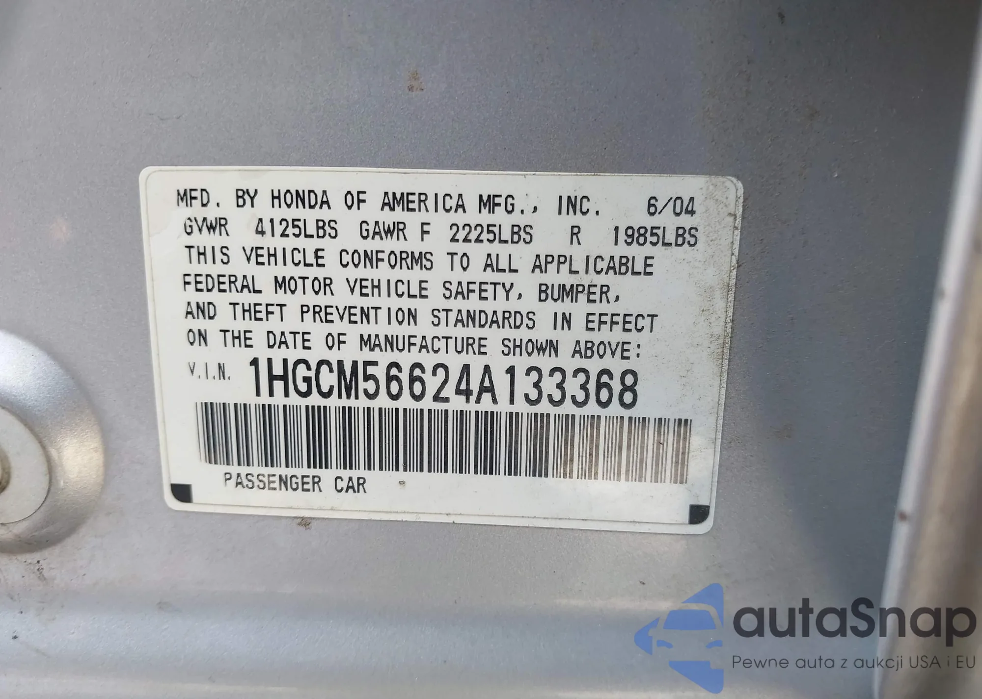 LOT: 42407112 VIN: 1HGCM56624A133368