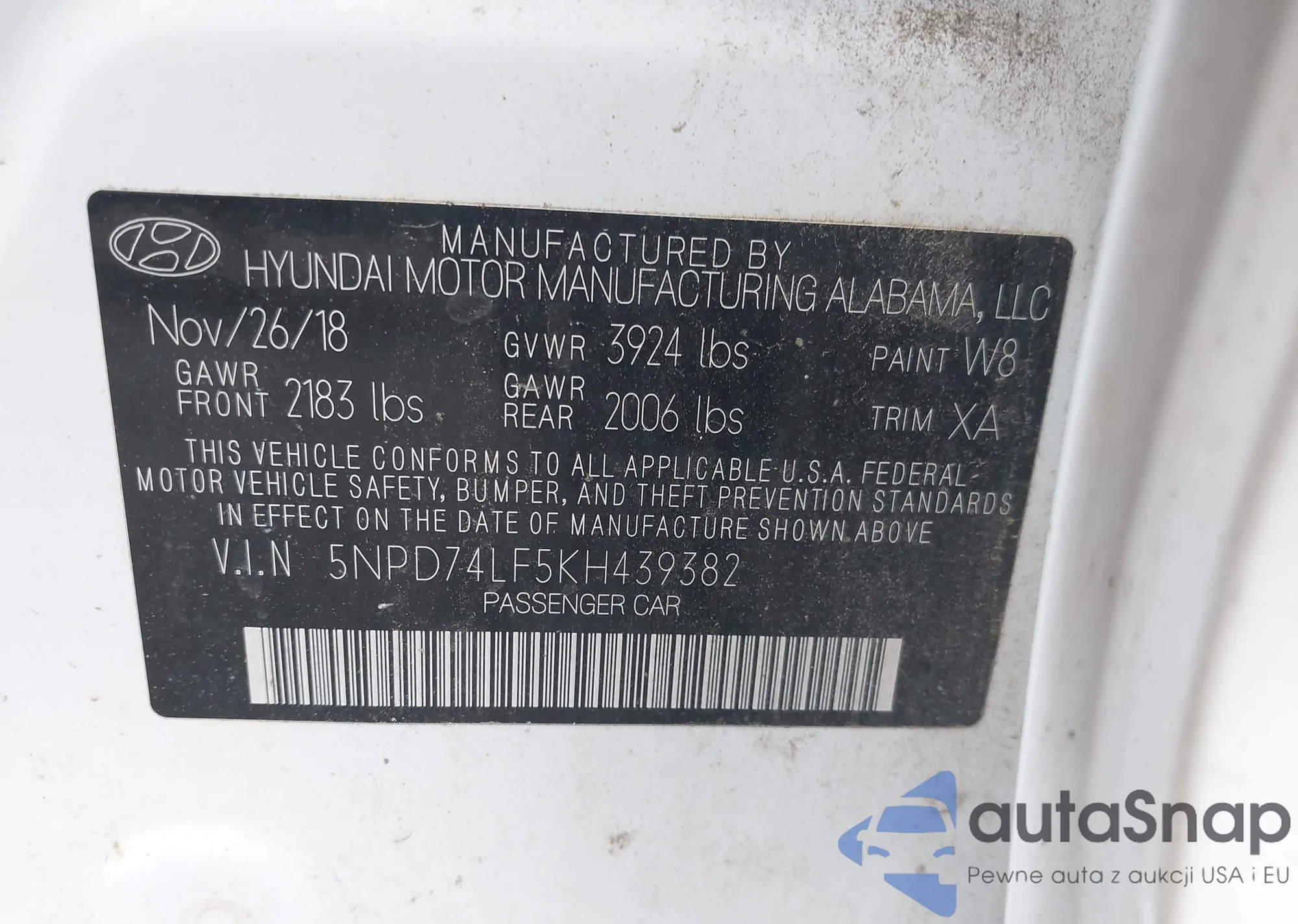 LOT: 42127441 VIN: 5NPD74LF5KH439382