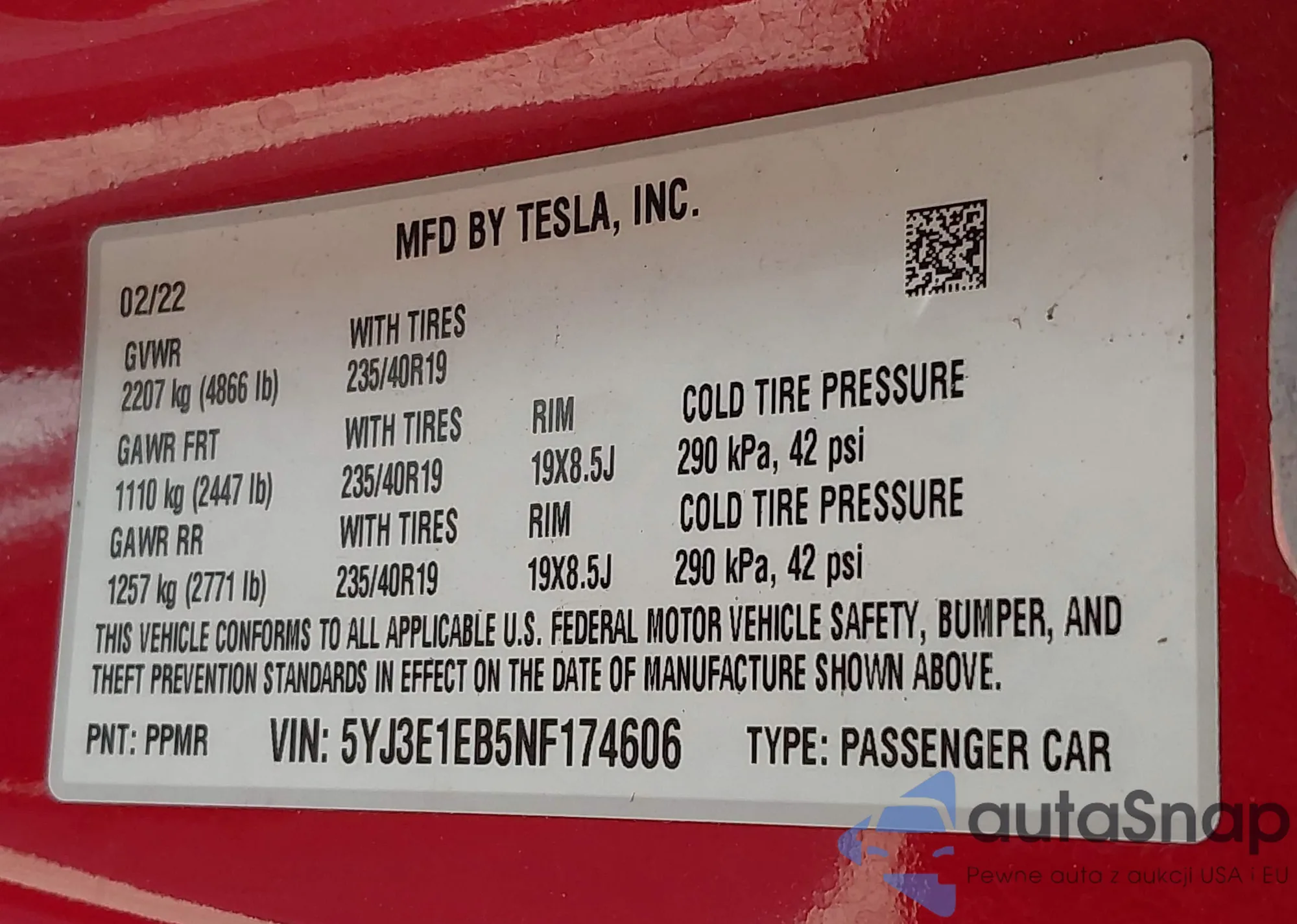 LOT: 42463894 VIN: 5YJ3E1EB5NF174606