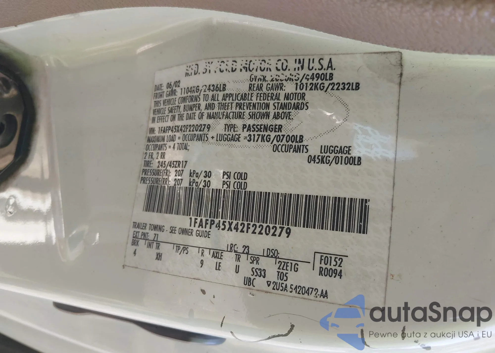 LOT: 42316008 VIN: 1FAFP45X42F220279