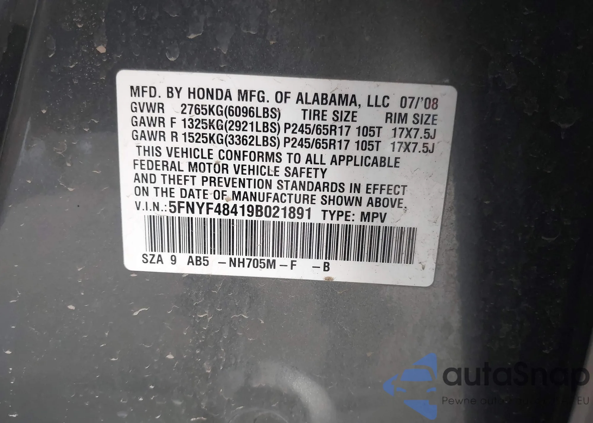 LOT: 42241327 VIN: 5FNYF48419B021891