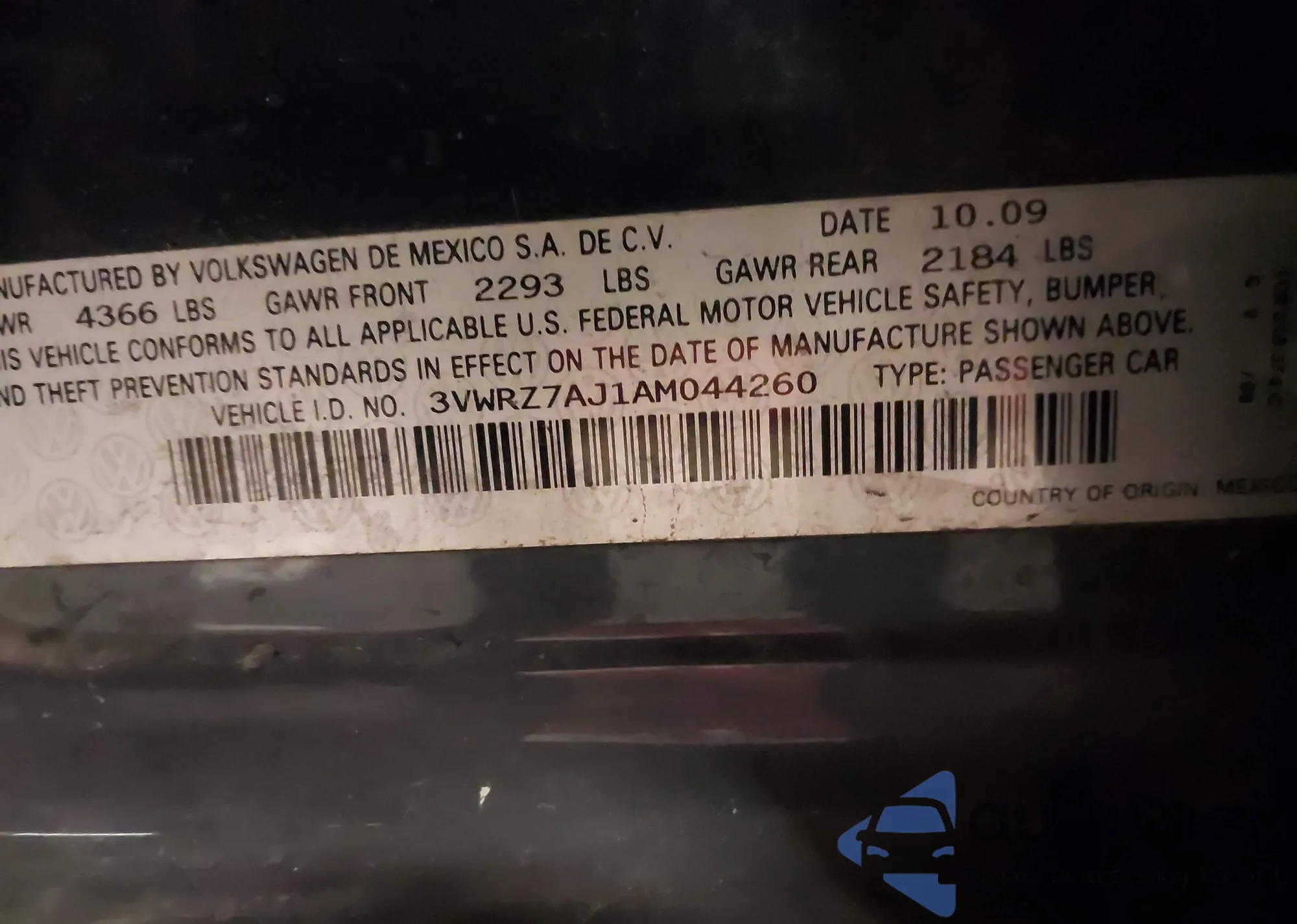 • VIN 3VWRZ7AJ1AM044260