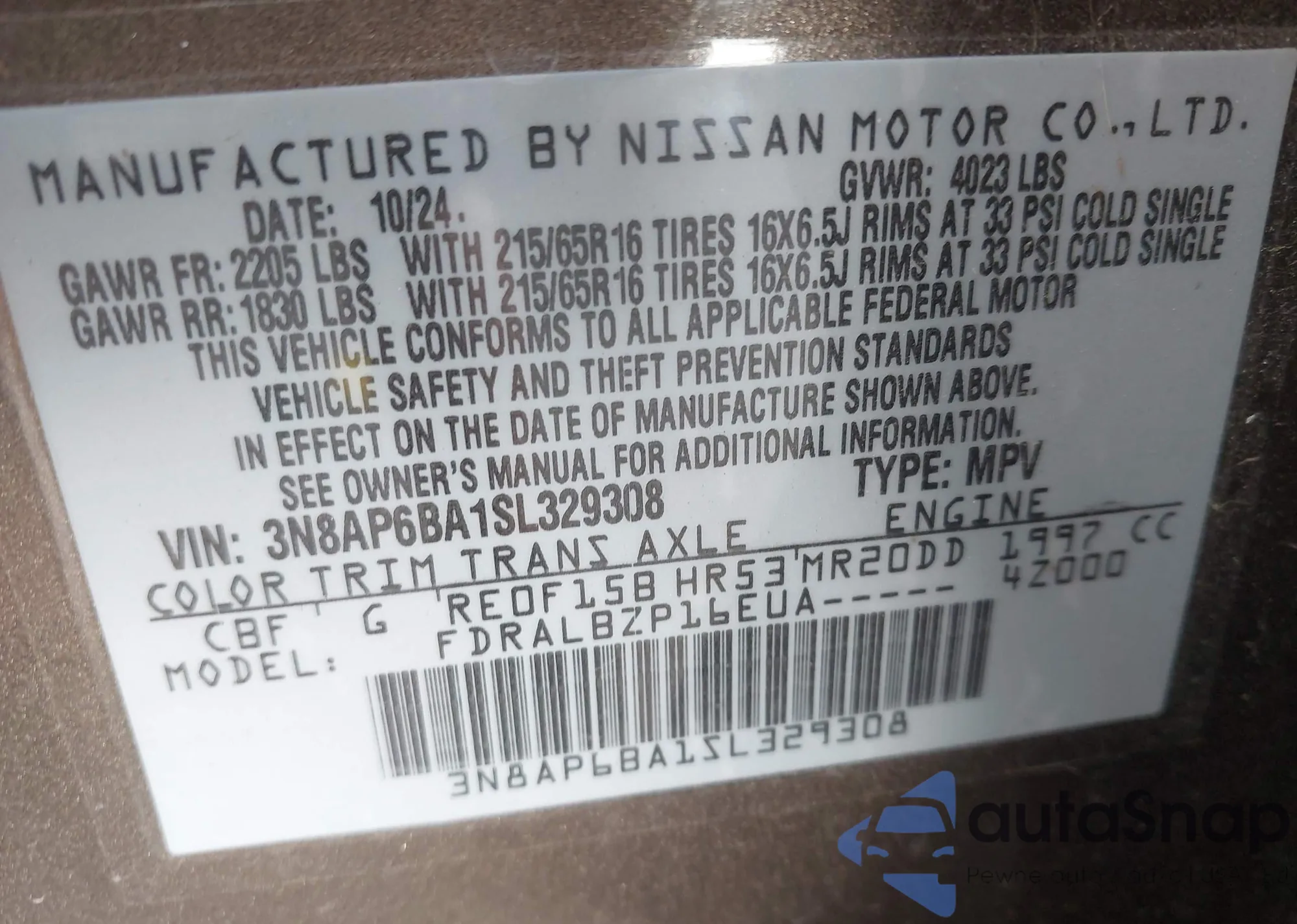 • VIN 3N8AP6BA1SL329308