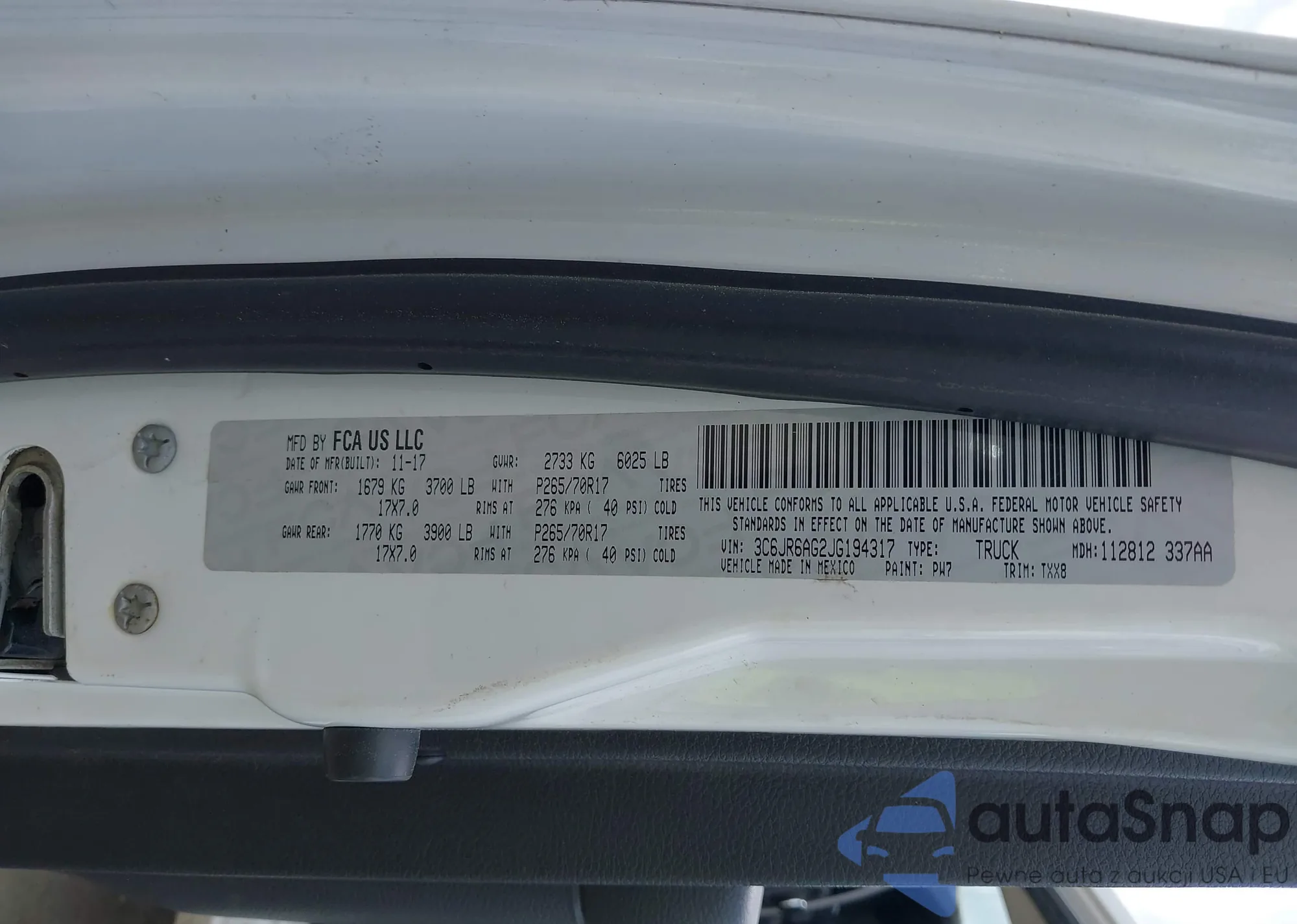 • VIN 3C6JR6AG2JG194317