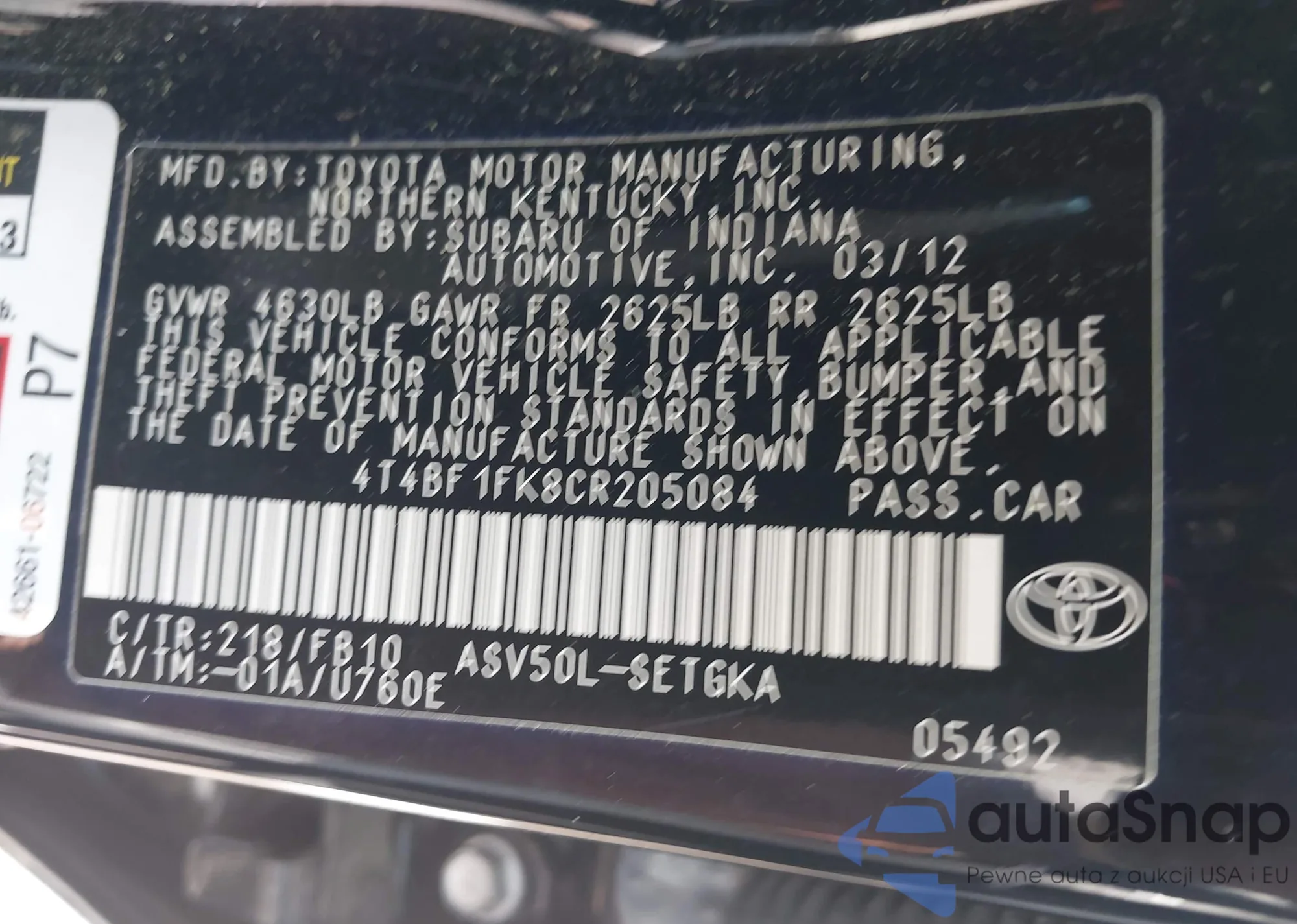 • VIN 4T4BF1FK8CR205084