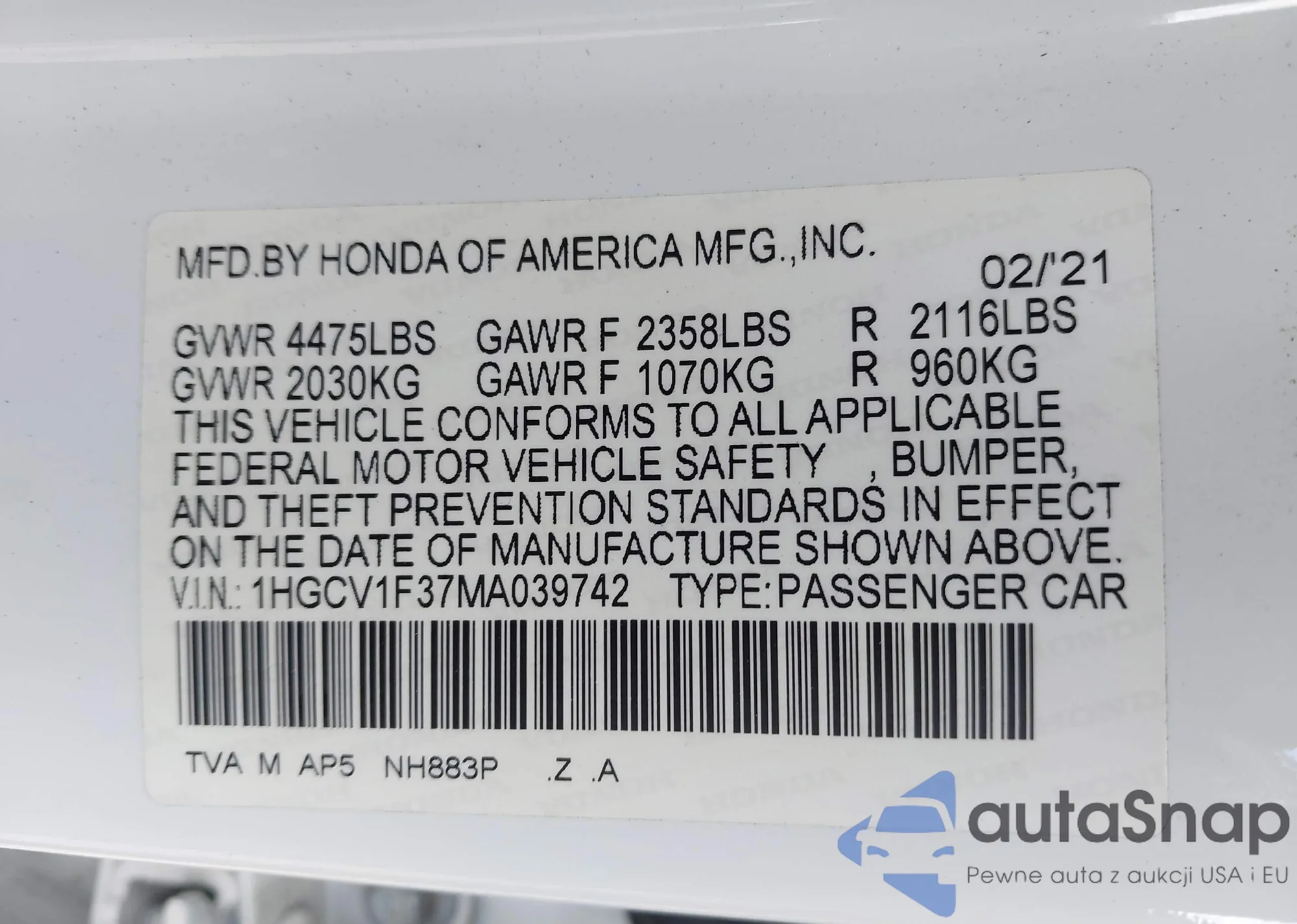 LOT: 42077460 VIN: 1HGCV1F37MA039742