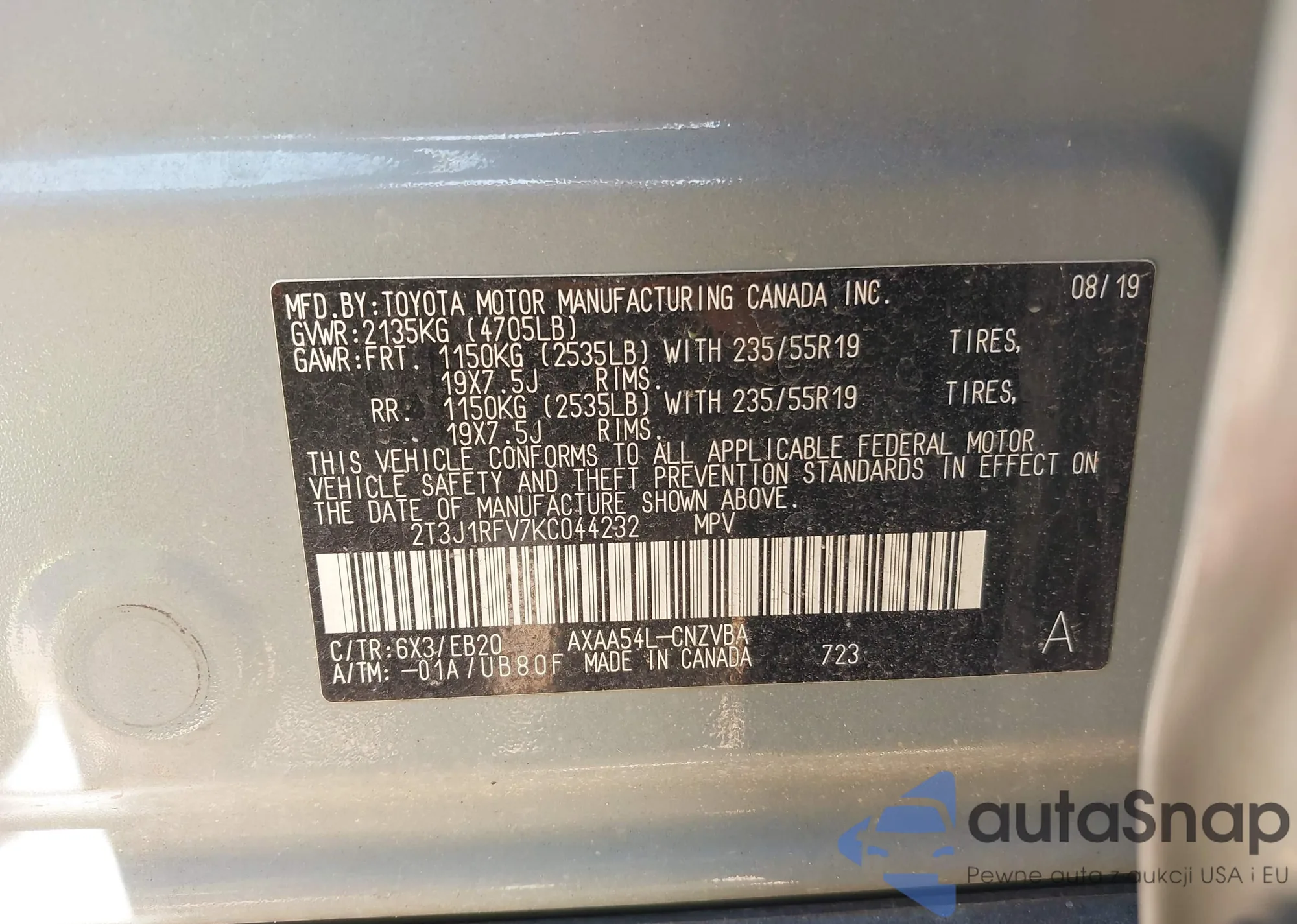 LOT: 42156035 VIN: 2T3J1RFV7KC044232