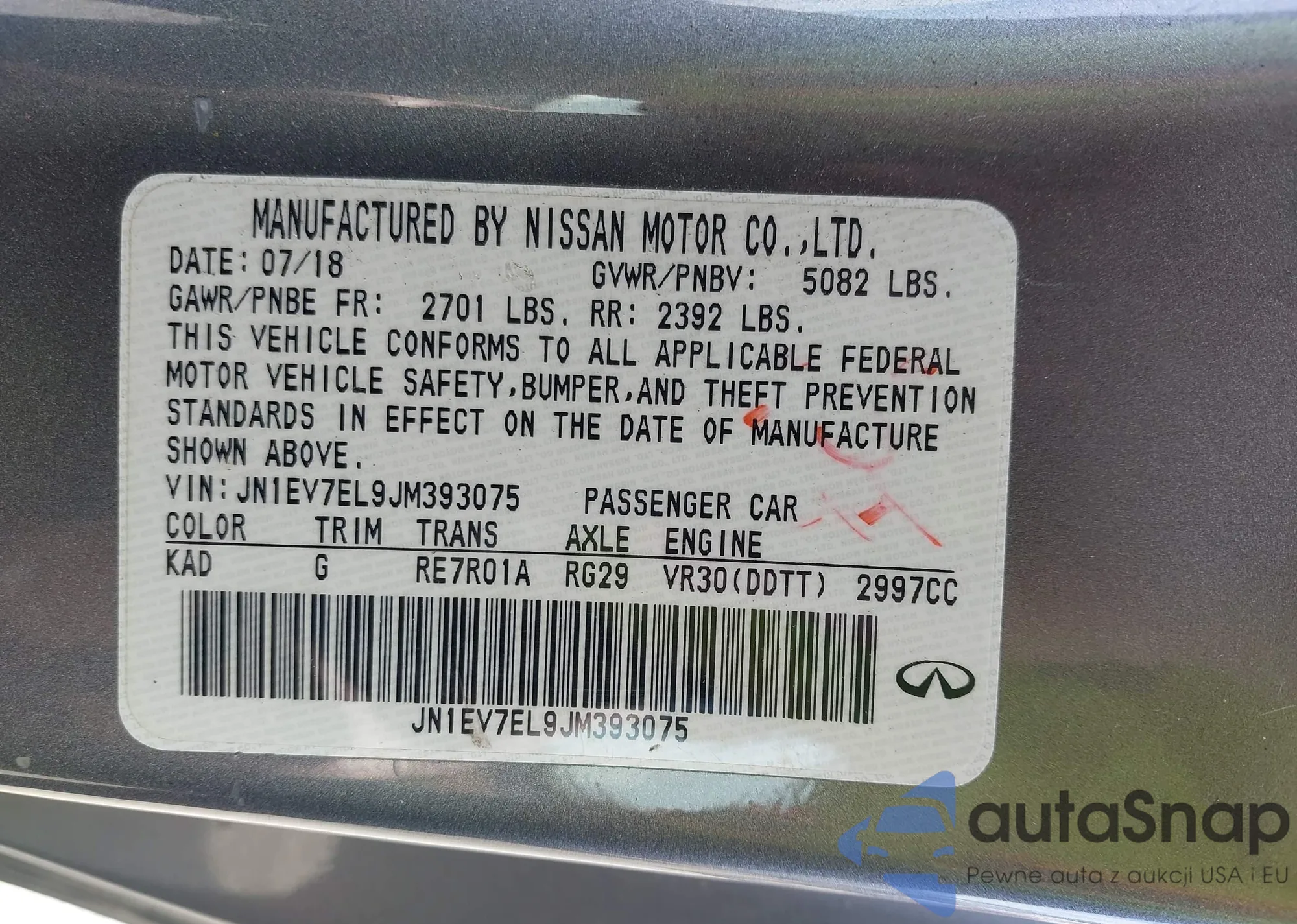 LOT: 42181186 VIN: JN1EV7EL9JM393075