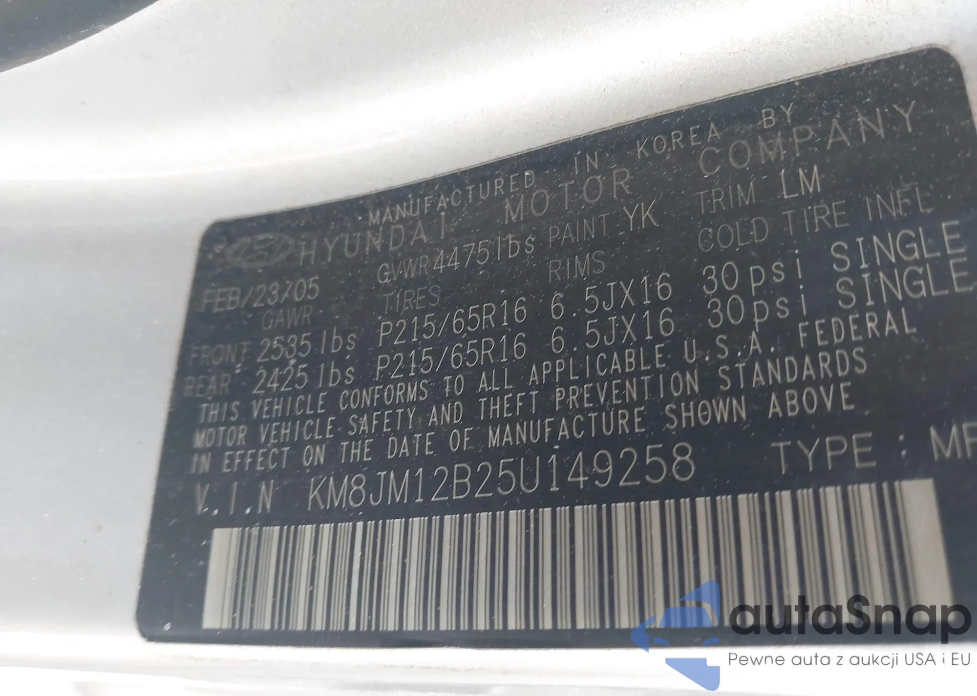 LOT: 42118966 VIN: KM8JM12B25U149258