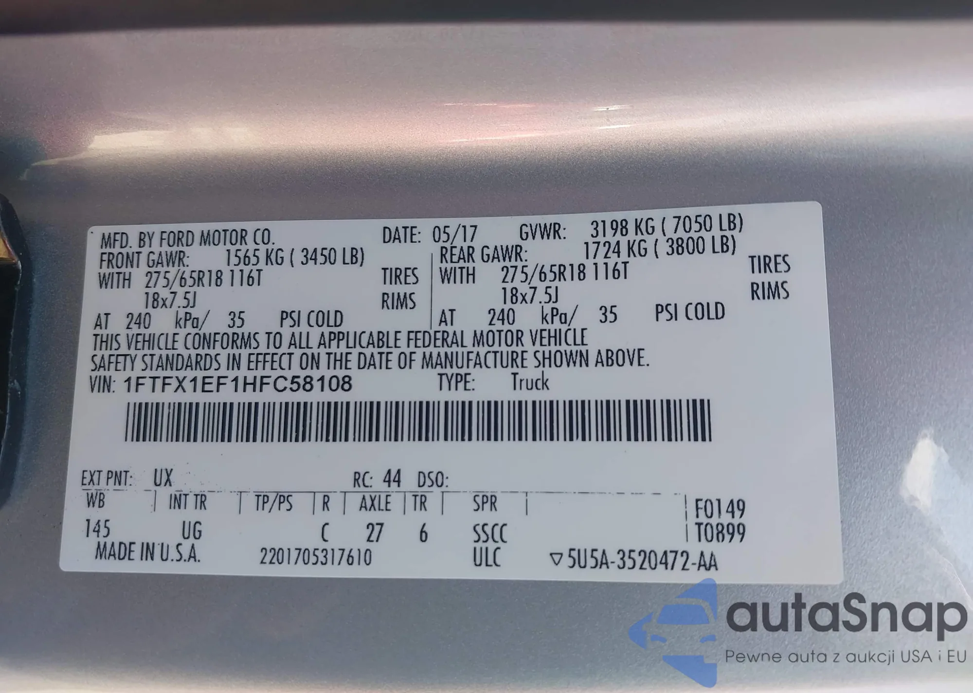 • VIN 1FTFX1EF1HFC58108