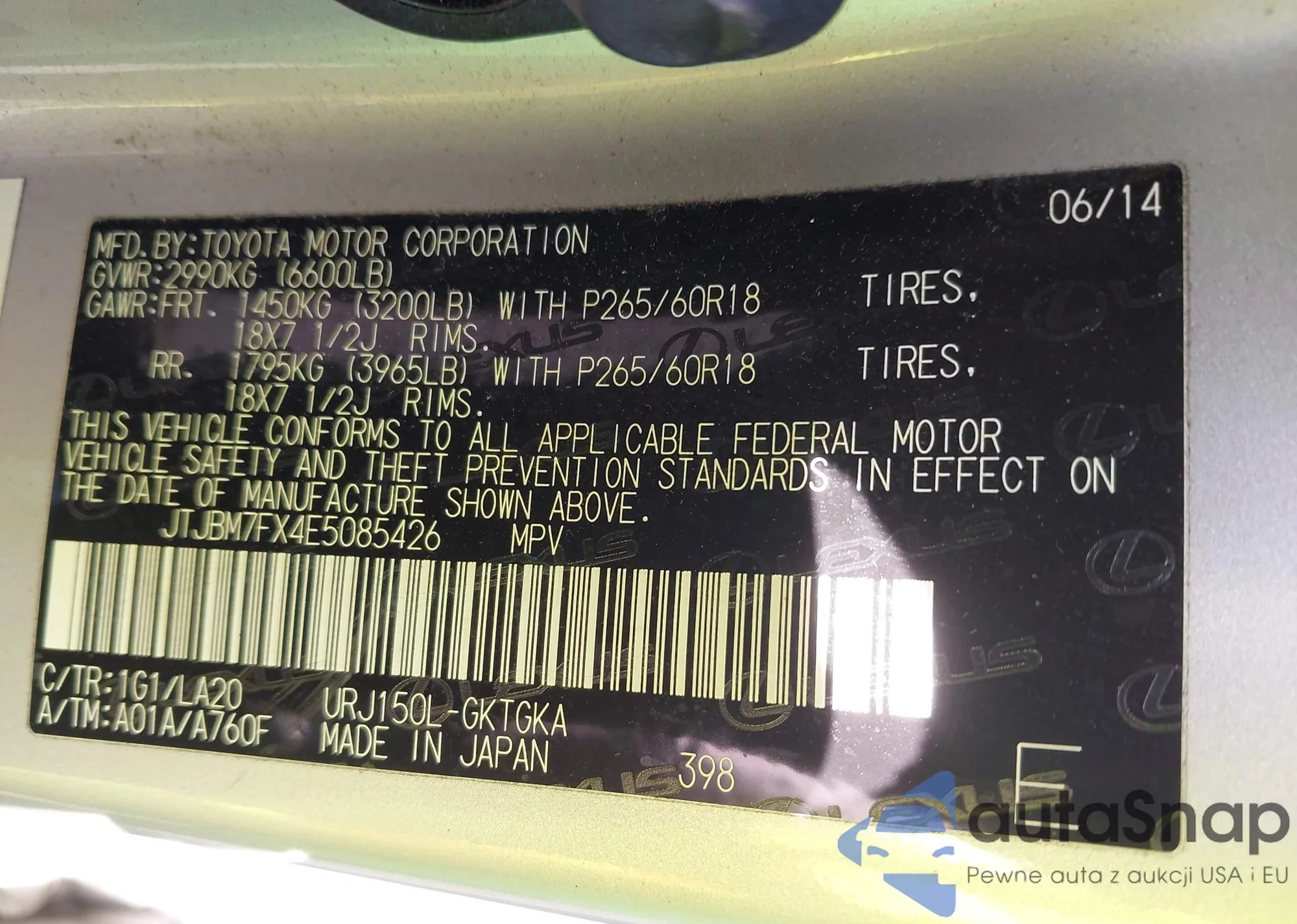 LOT: 42165540 VIN: JTJBM7FX4E5085426