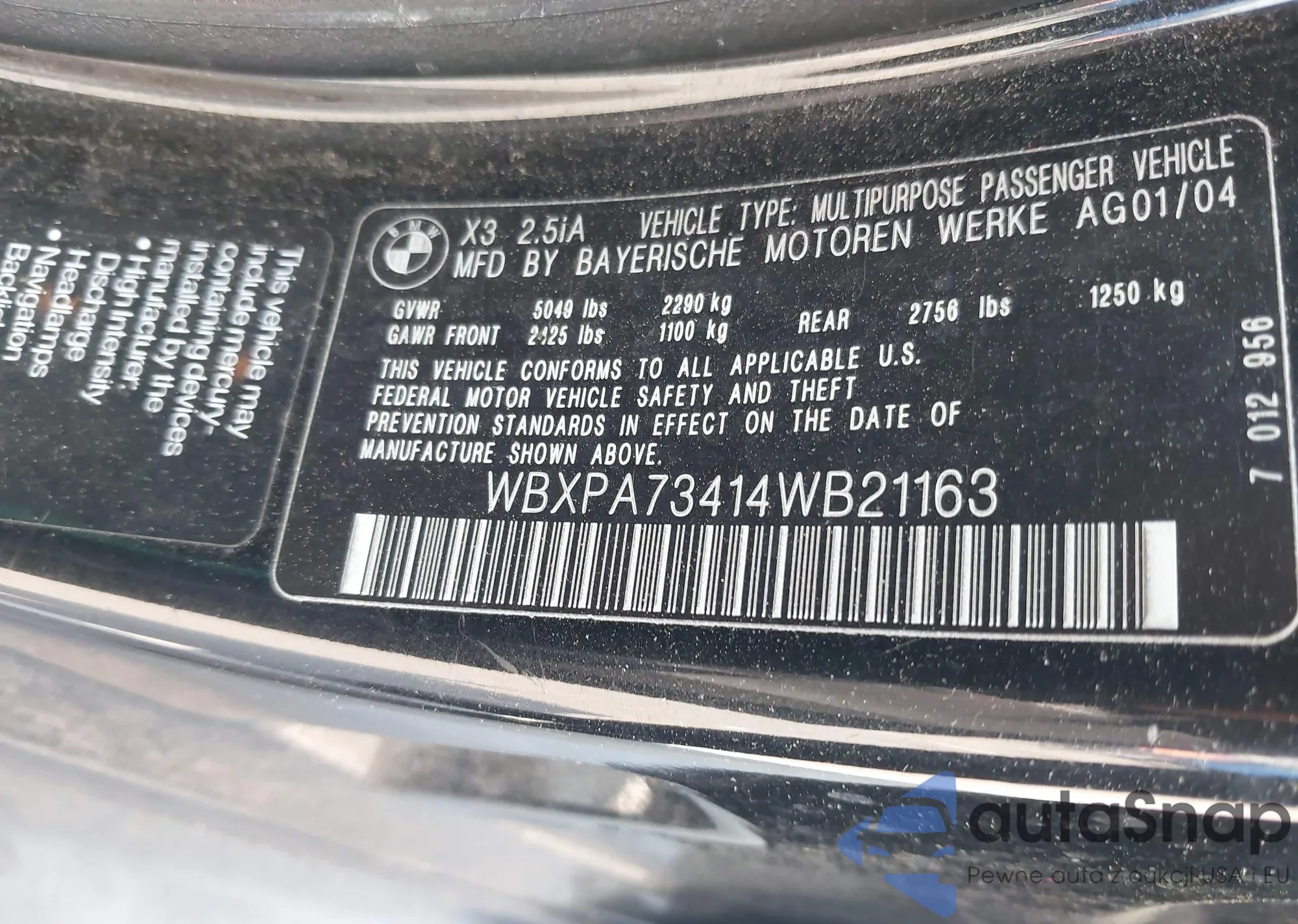 2004 BMW X3 2.5I z USA, uszkodzony, nr VIN WBXPA73414WB21163