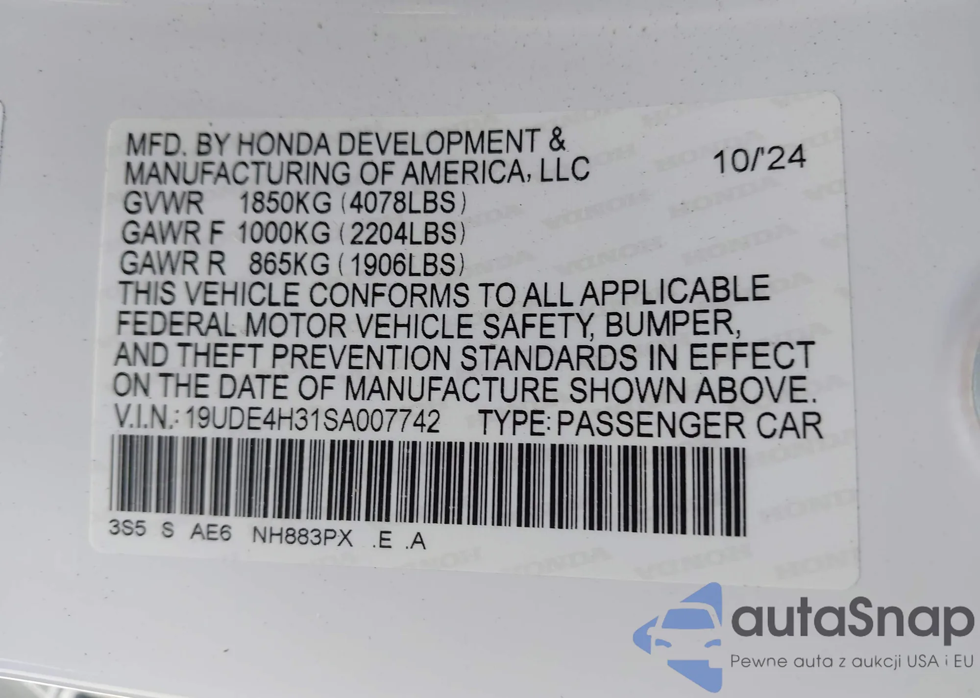 • VIN 19UDE4H31SA007742