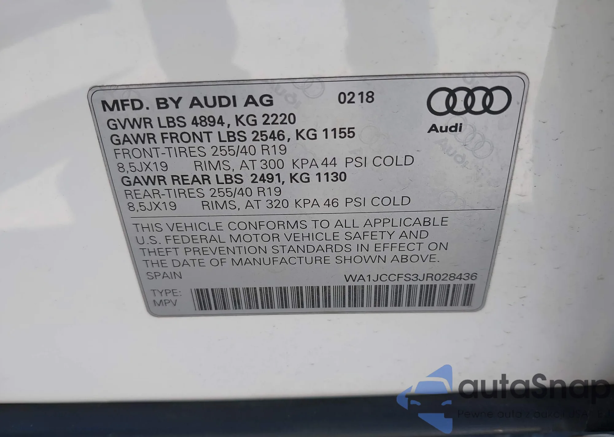 LOT: 42067256 VIN: WA1JCCFS3JR028436