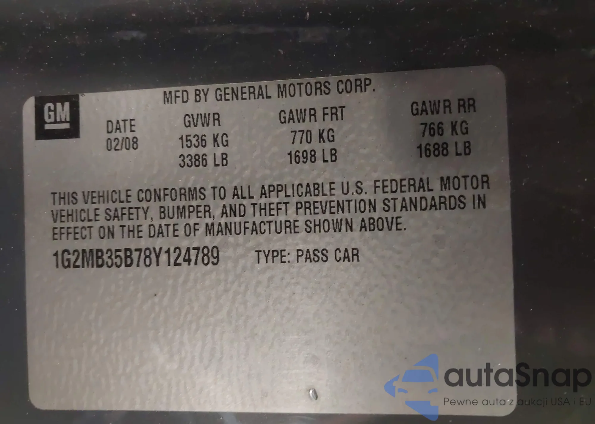 LOT: 41933954 VIN: 1G2MB35B78Y124789