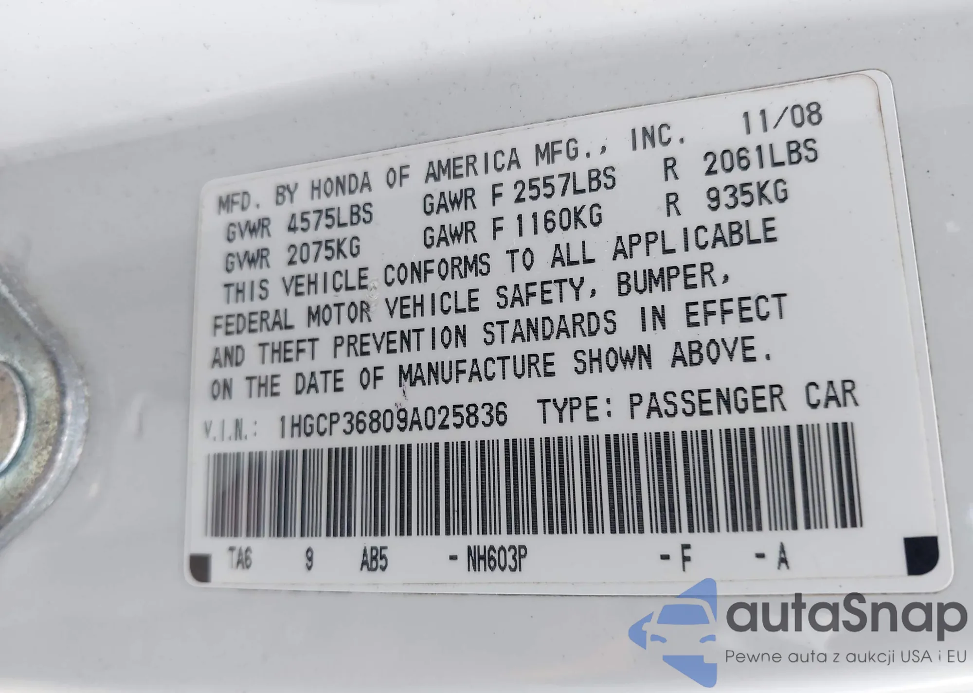 LOT: 42084971 VIN: 1HGCP36809A025836