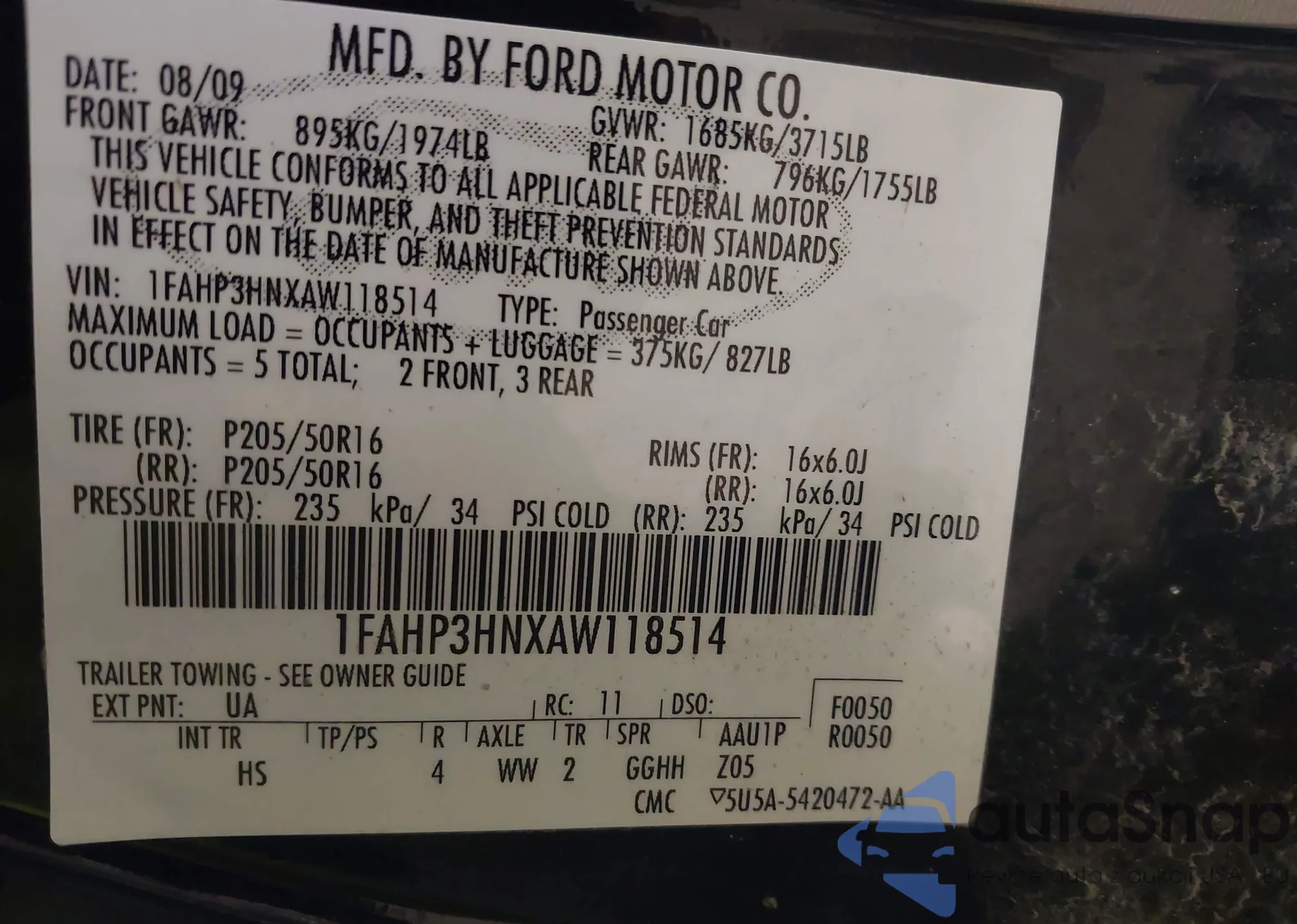 • VIN 1FAHP3HNXAW118514