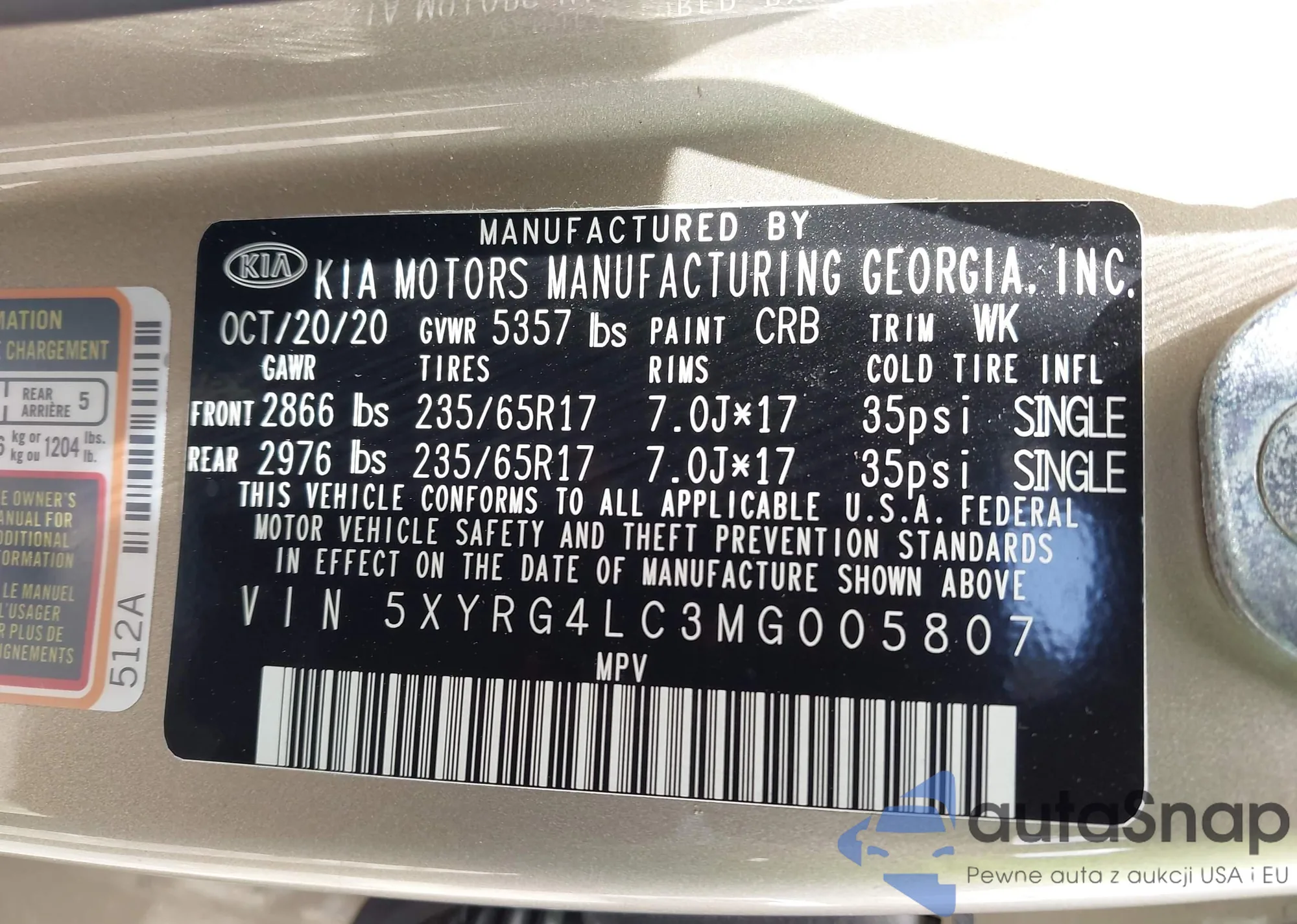 LOT: 42204914 VIN: 5XYRG4LC3MG005807