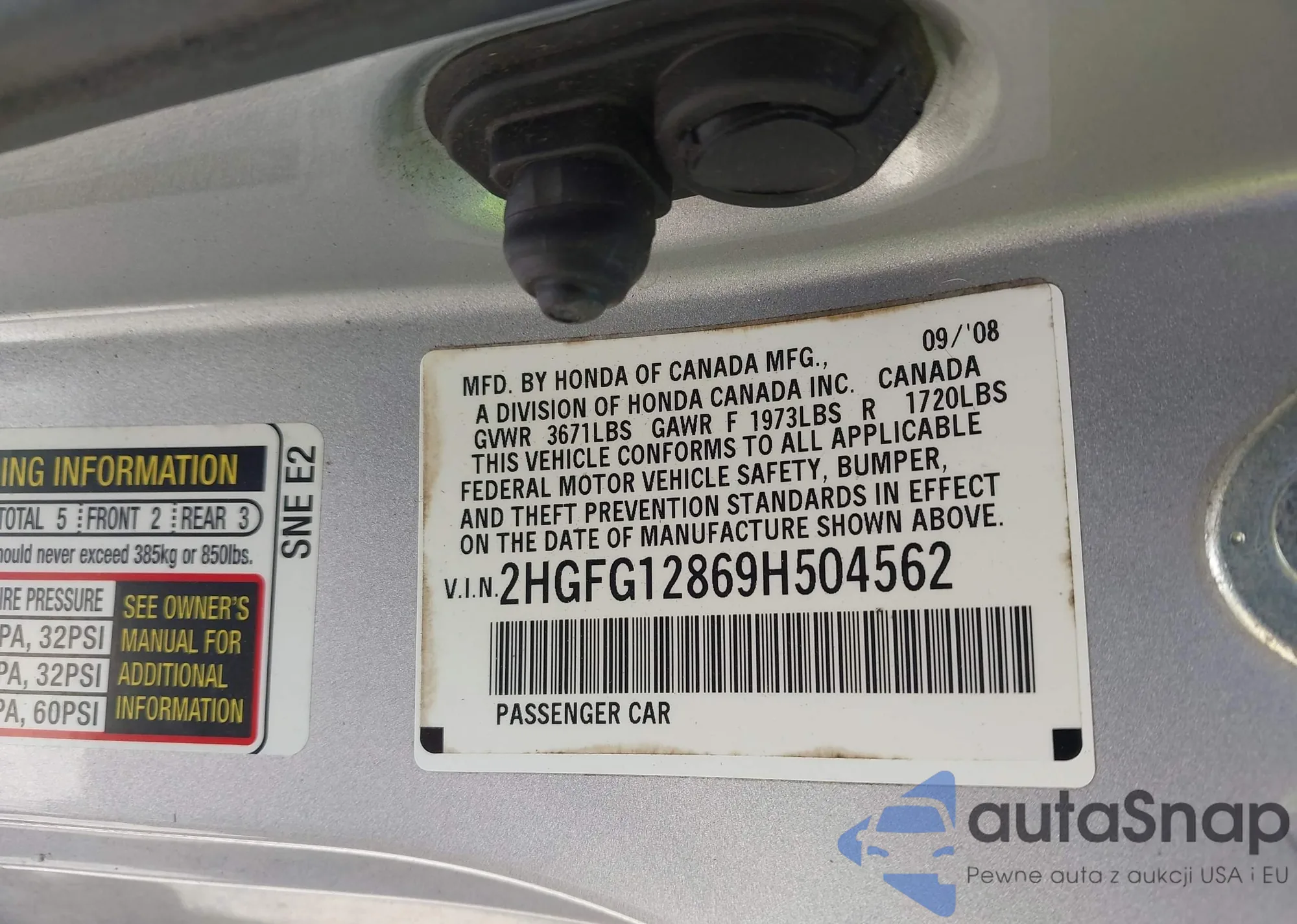 LOT: 42290792 VIN: 2HGFG12869H504562
