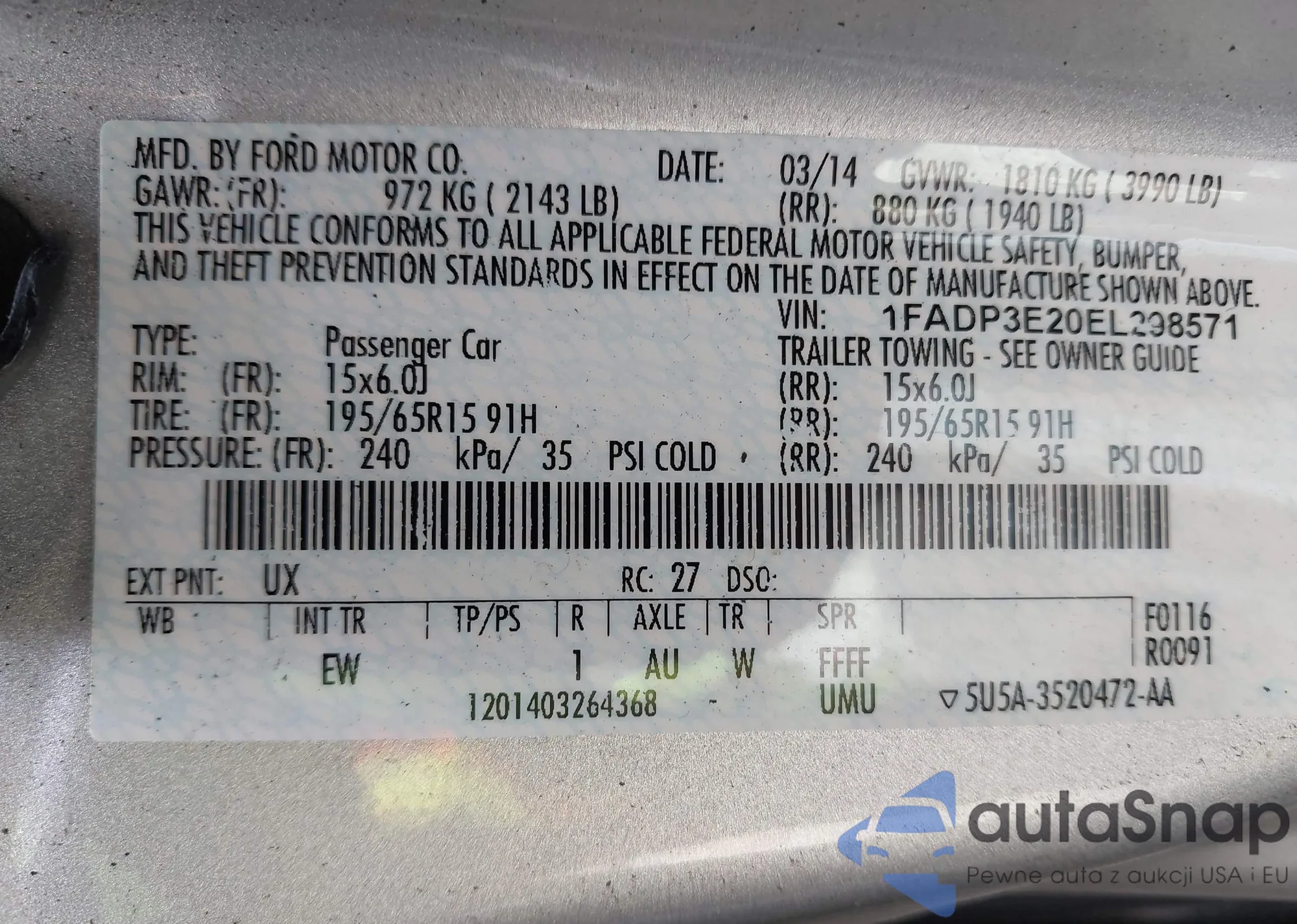 LOT: 42312519 VIN: 1FADP3E20EL298571