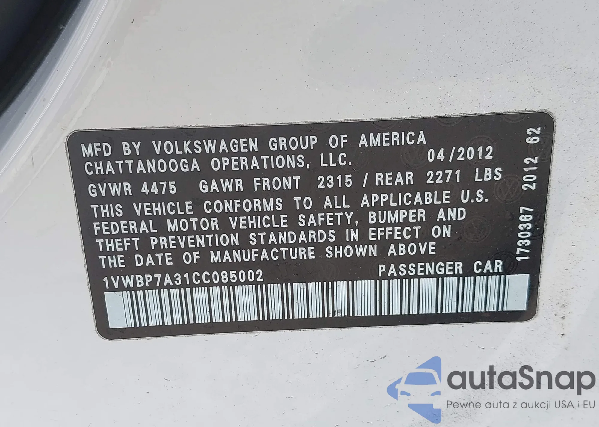 LOT: 42318915 VIN: 1VWBP7A31CC085002
