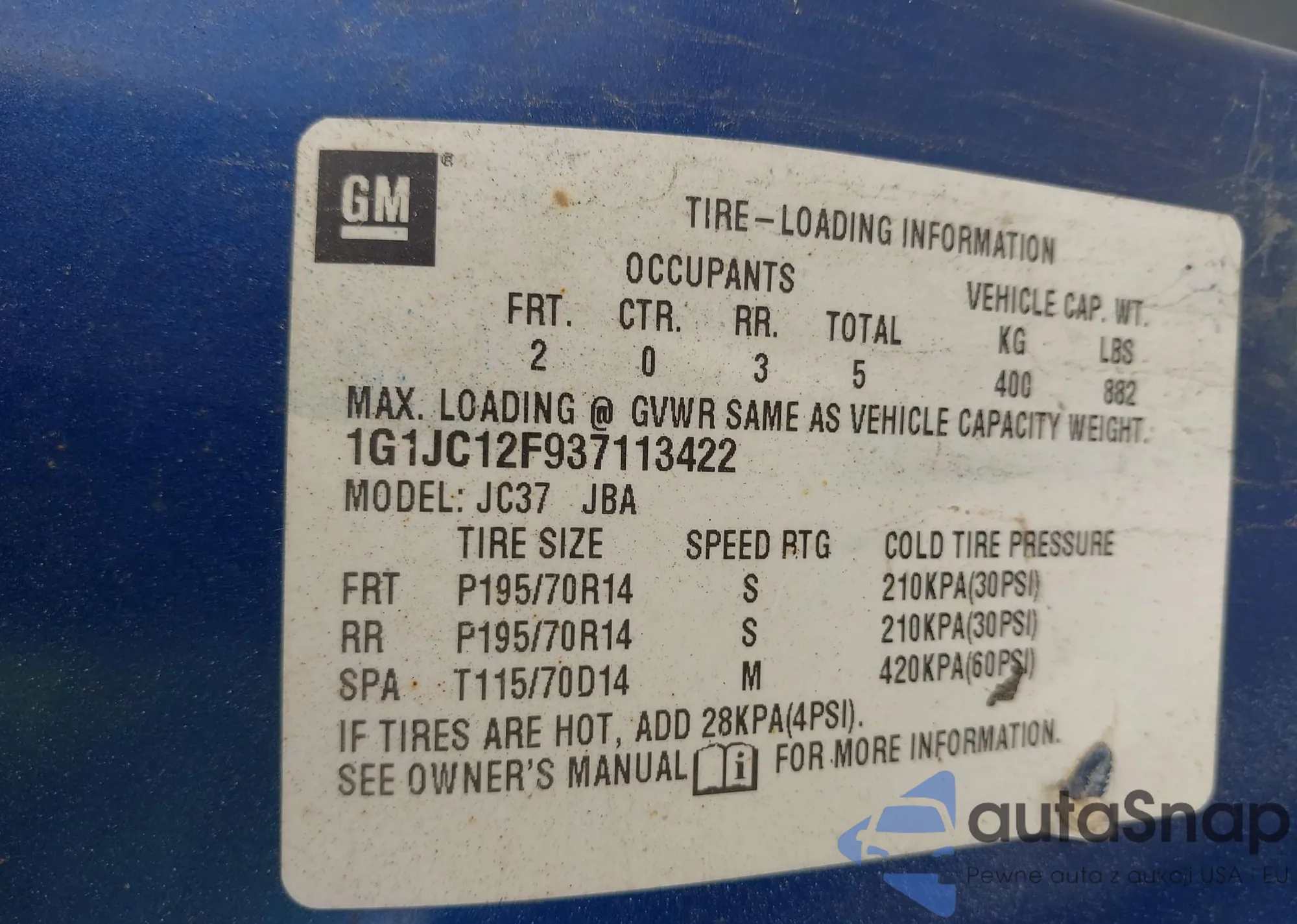 • VIN 1G1JC12F937113422