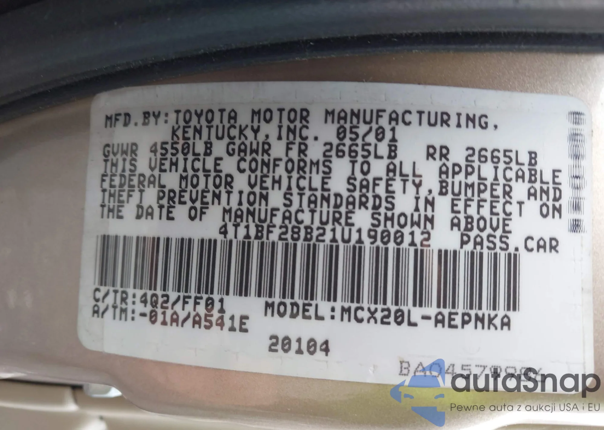 LOT: 42320551 VIN: 4T1BF28B21U190012