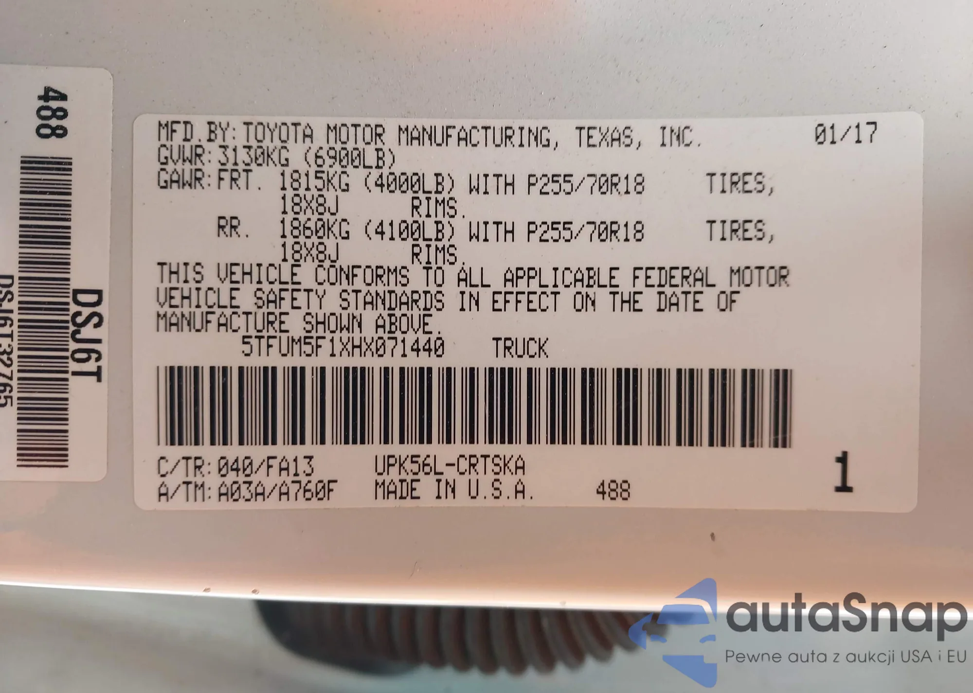 • VIN 5TFUM5F1XHX071440