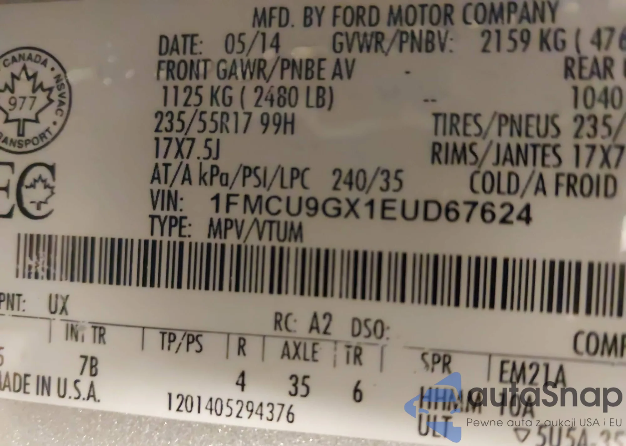 • VIN 1FMCU9GX1EUD67624
