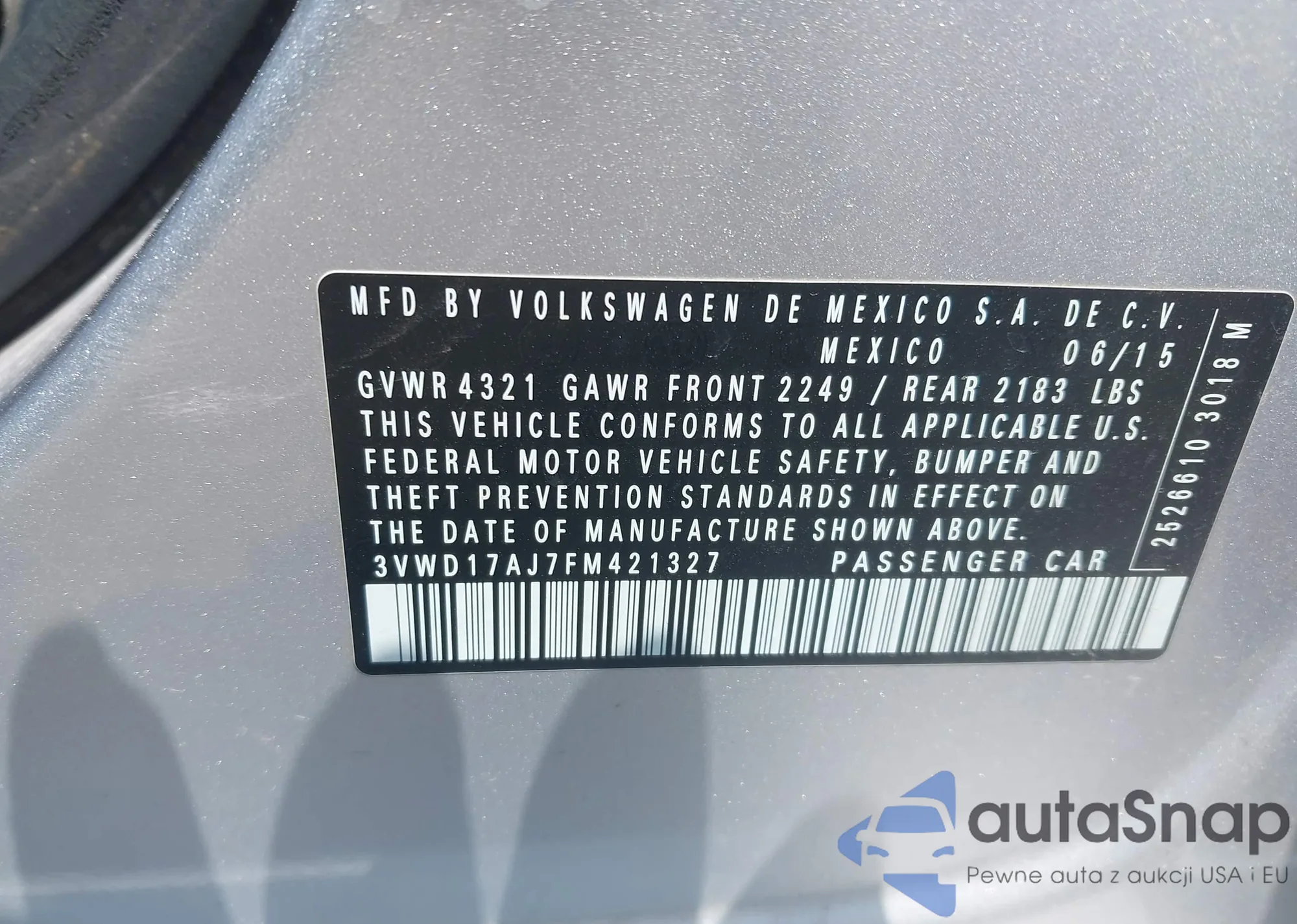 • VIN 3VWD17AJ7FM421327