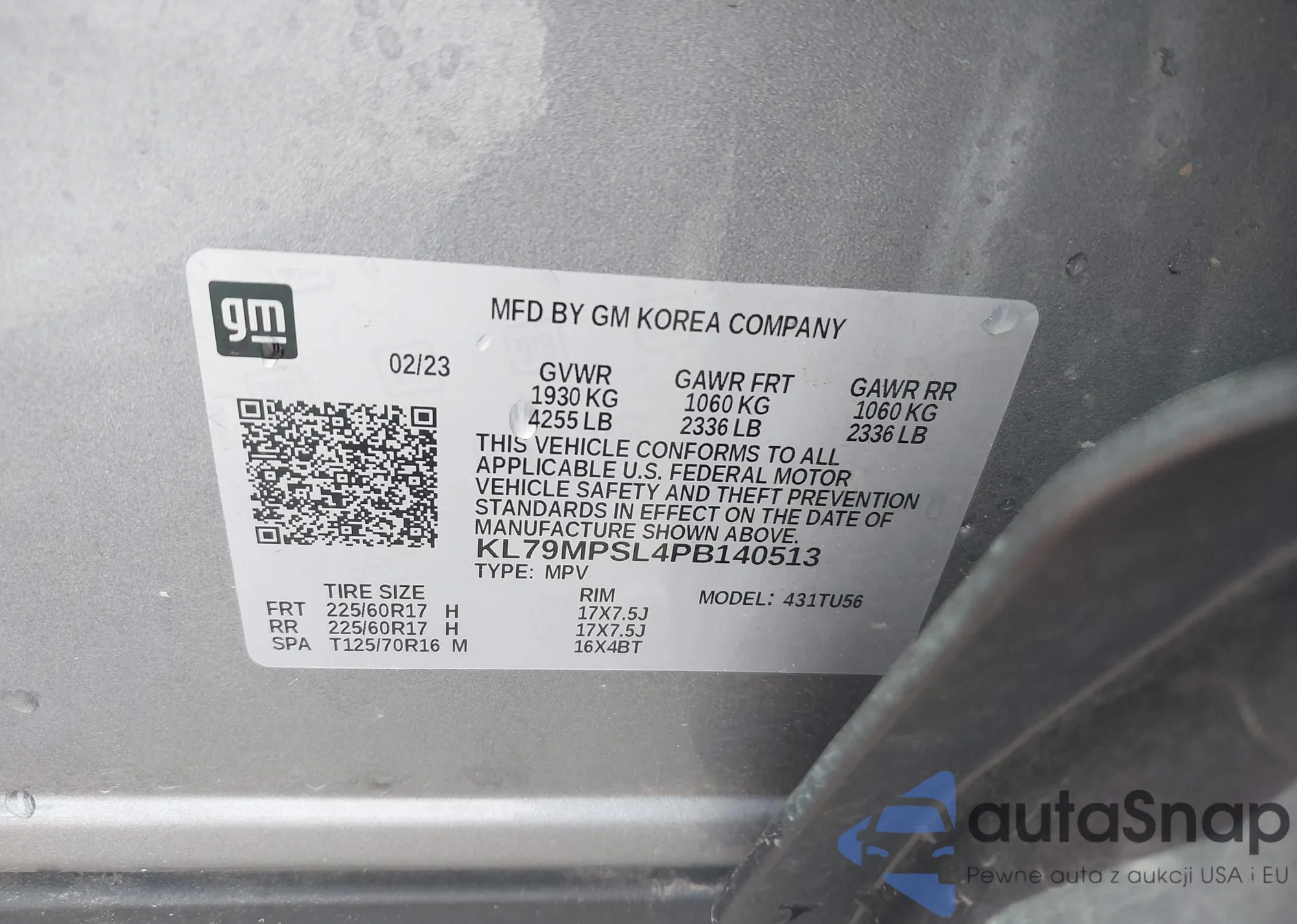 LOT: 42220507 VIN: KL79MPSL4PB140513