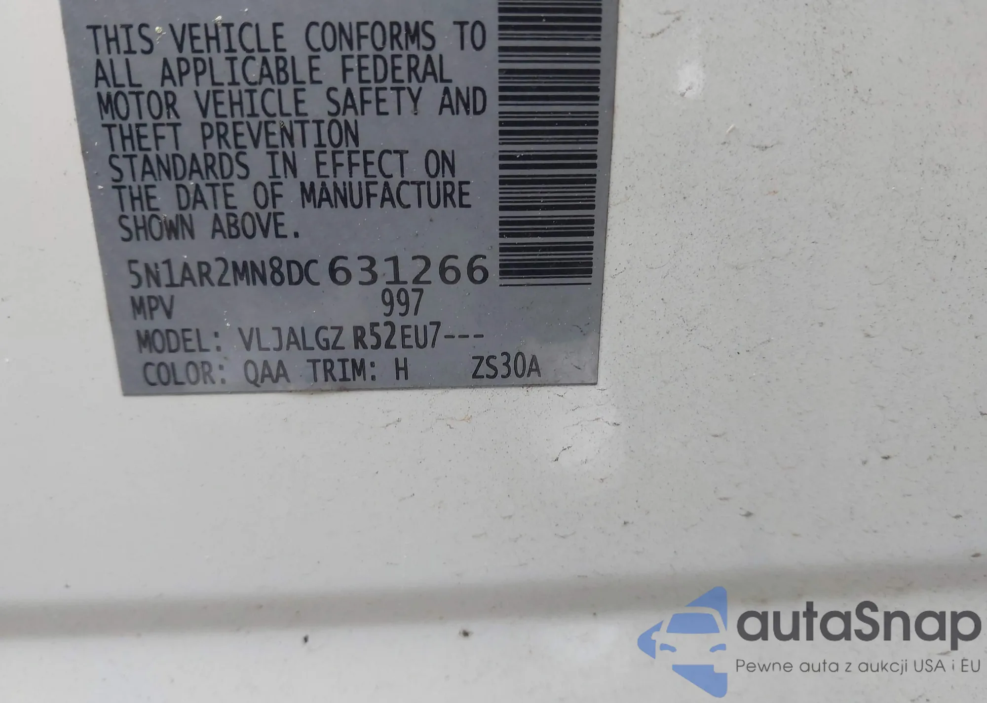 • VIN 5N1AR2MN8DC631266