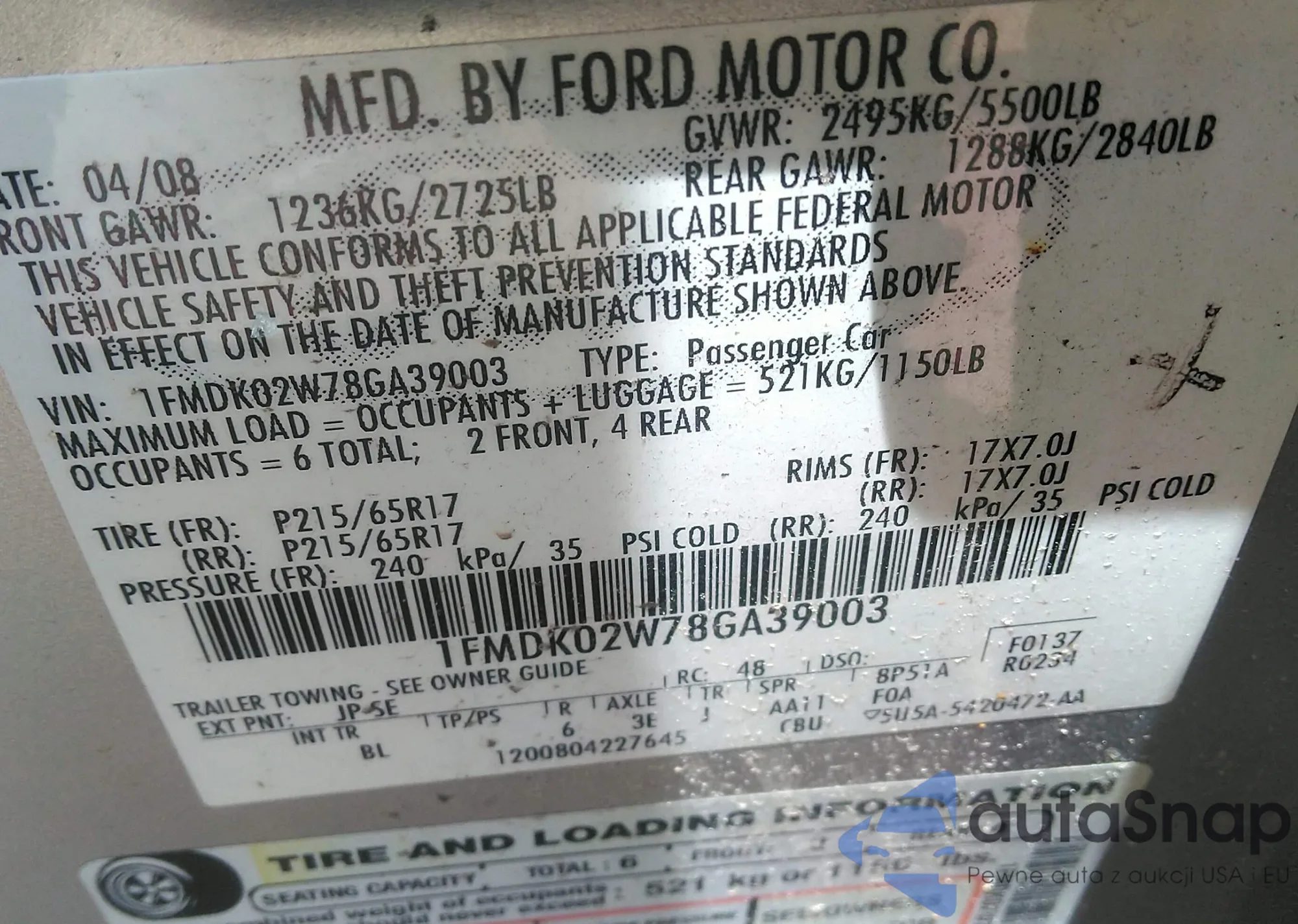 LOT: 42306930 VIN: 1FMDK02W78GA39003
