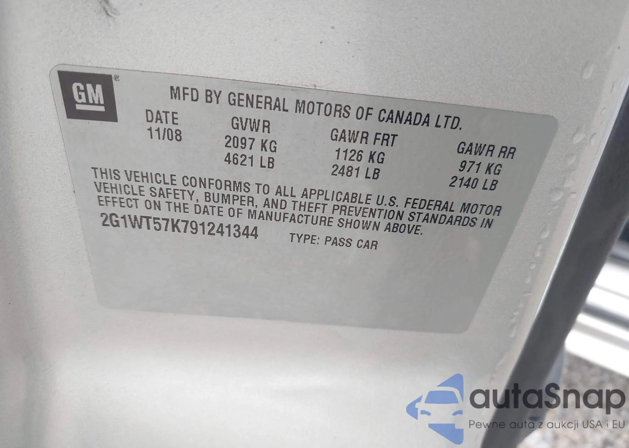 • VIN 2G1WT57K791241344