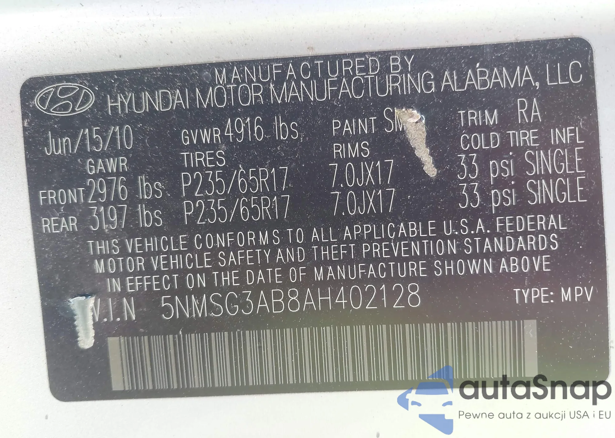 • VIN 5NMSG3AB8AH402128