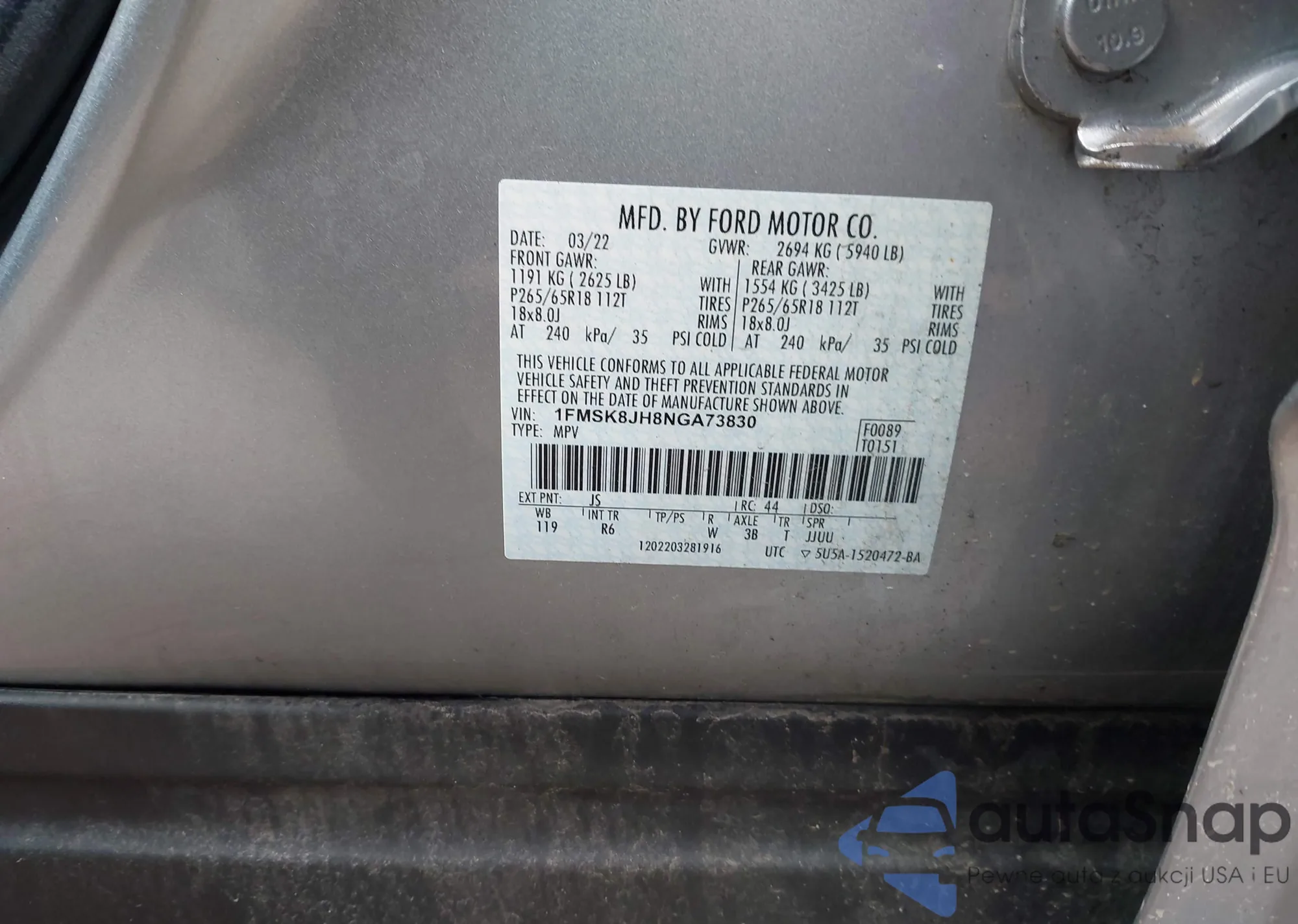 LOT: 42212478 VIN: 1FMSK8JH8NGA73830