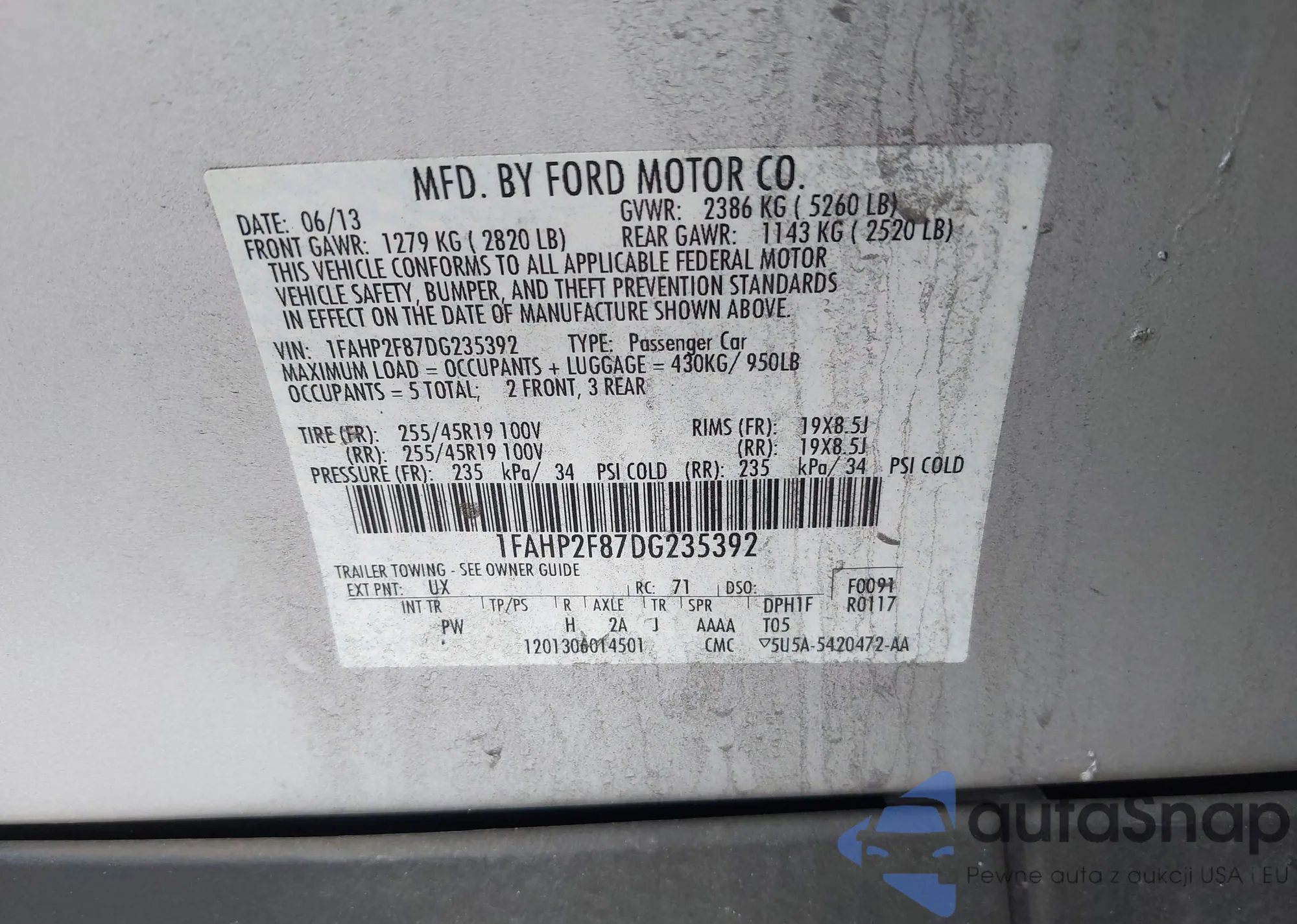 LOT: 42431543 VIN: 1FAHP2F87DG235392