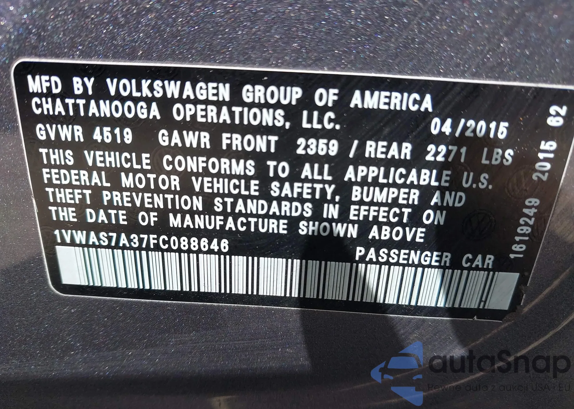 LOT: 42050356 VIN: 1VWAS7A37FC088646