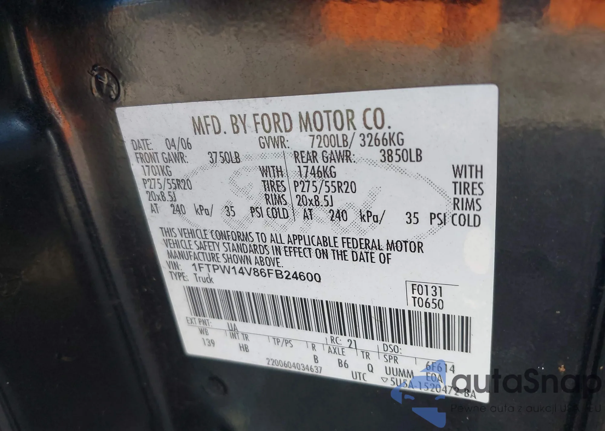 LOT: 42490415 VIN: 1FTPW14V86FB24600