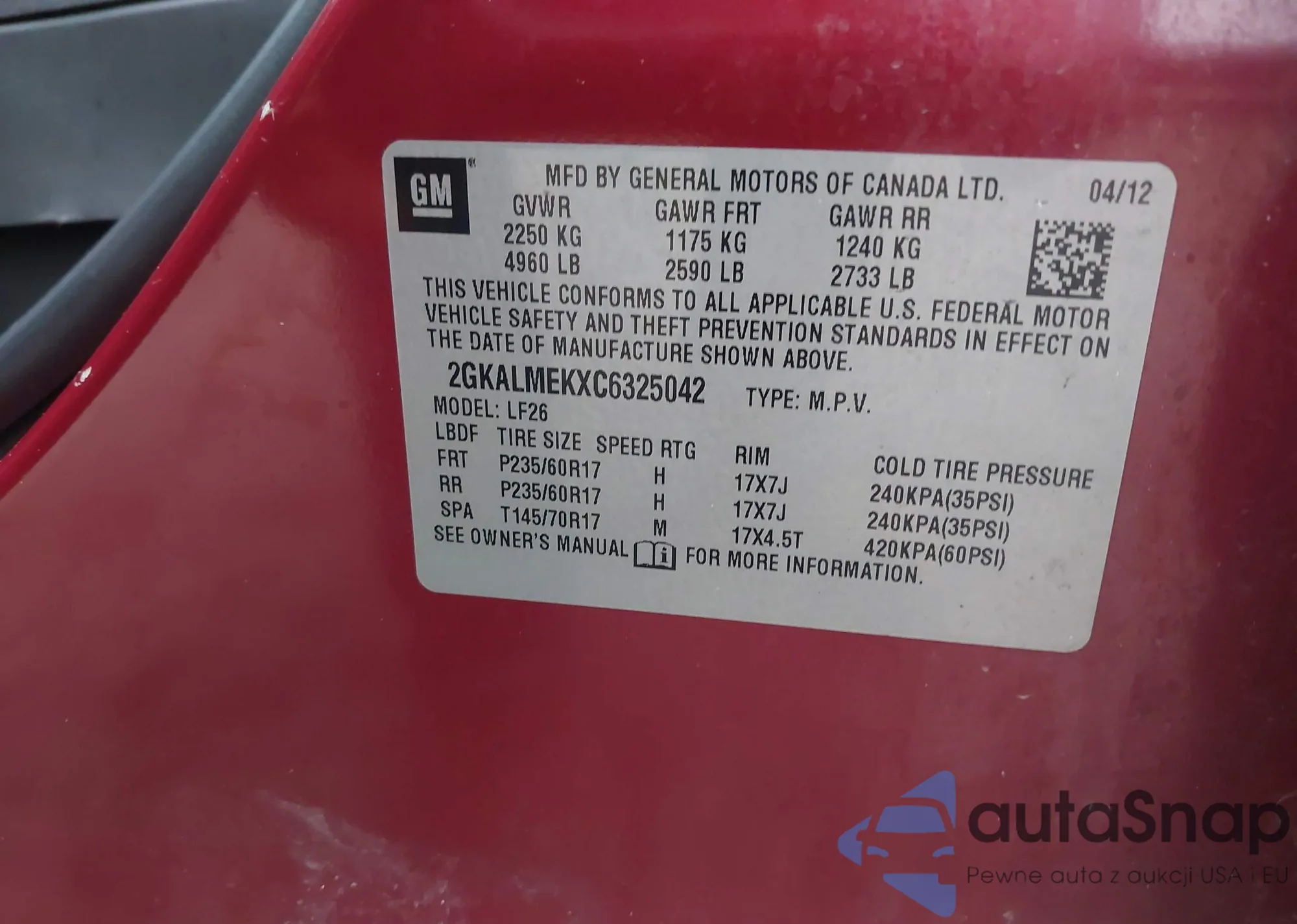 • VIN 2GKALMEKXC6325042
