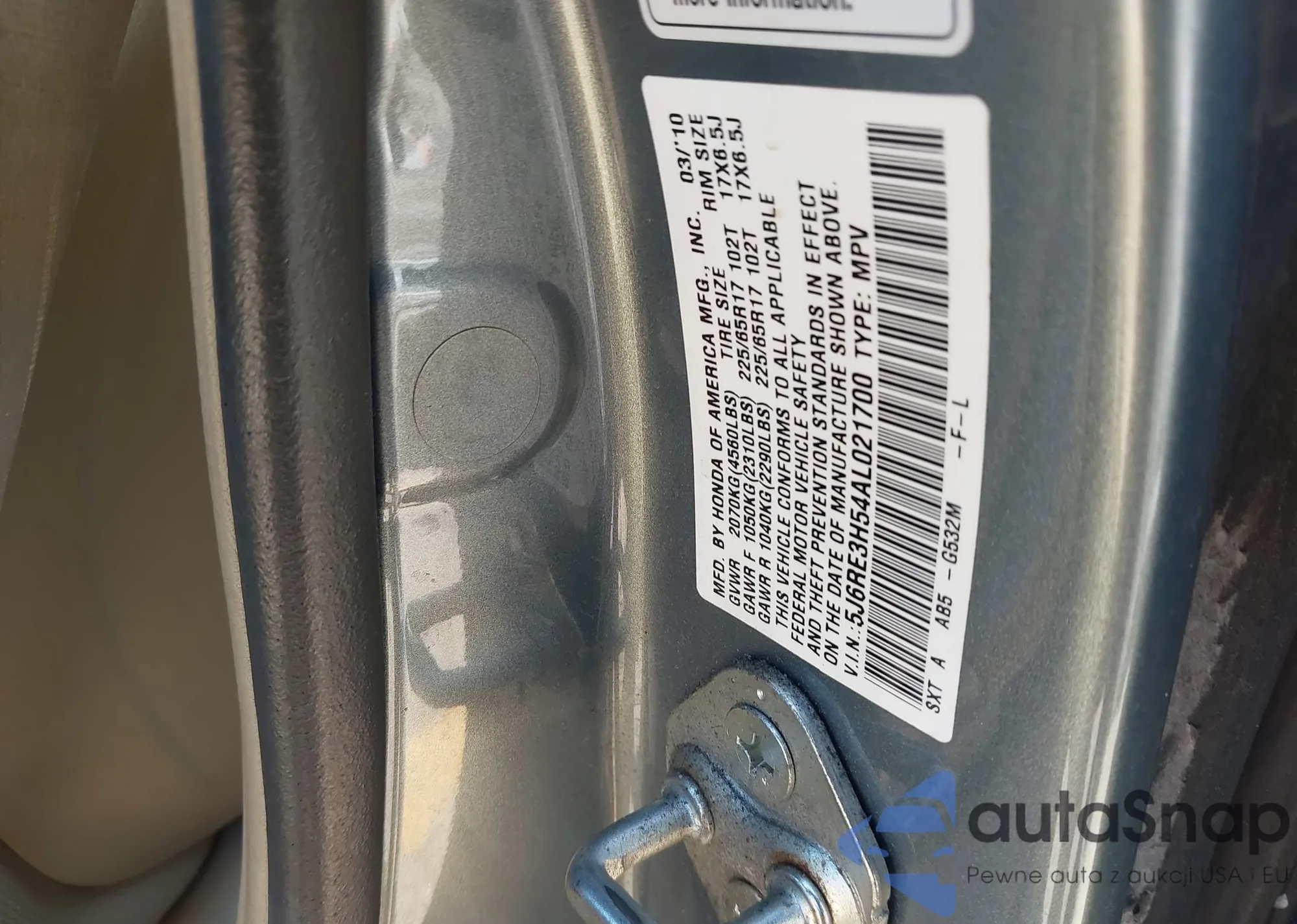 • VIN 5J6RE3H54AL021700