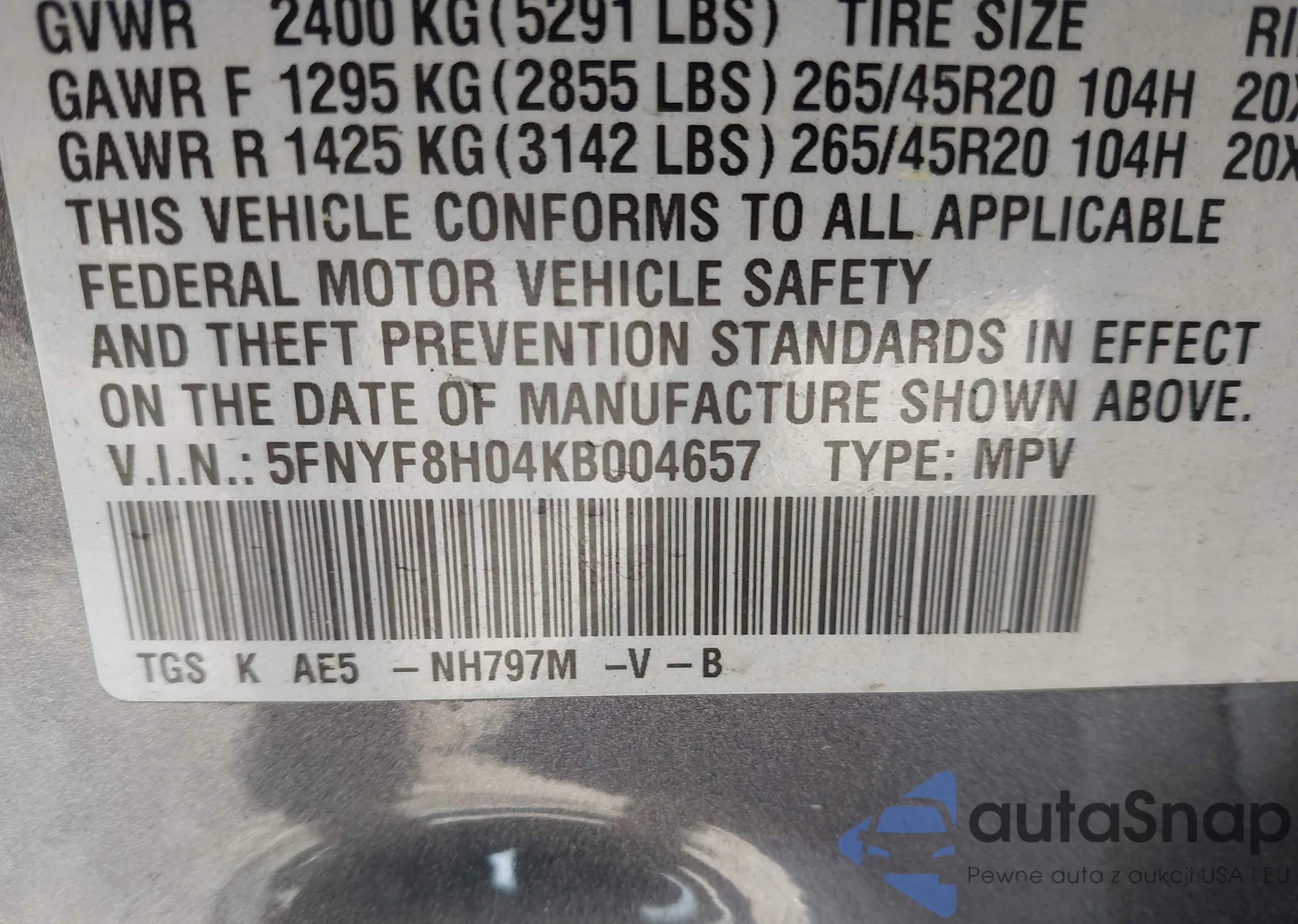 • VIN 5FNYF8H04KB004657