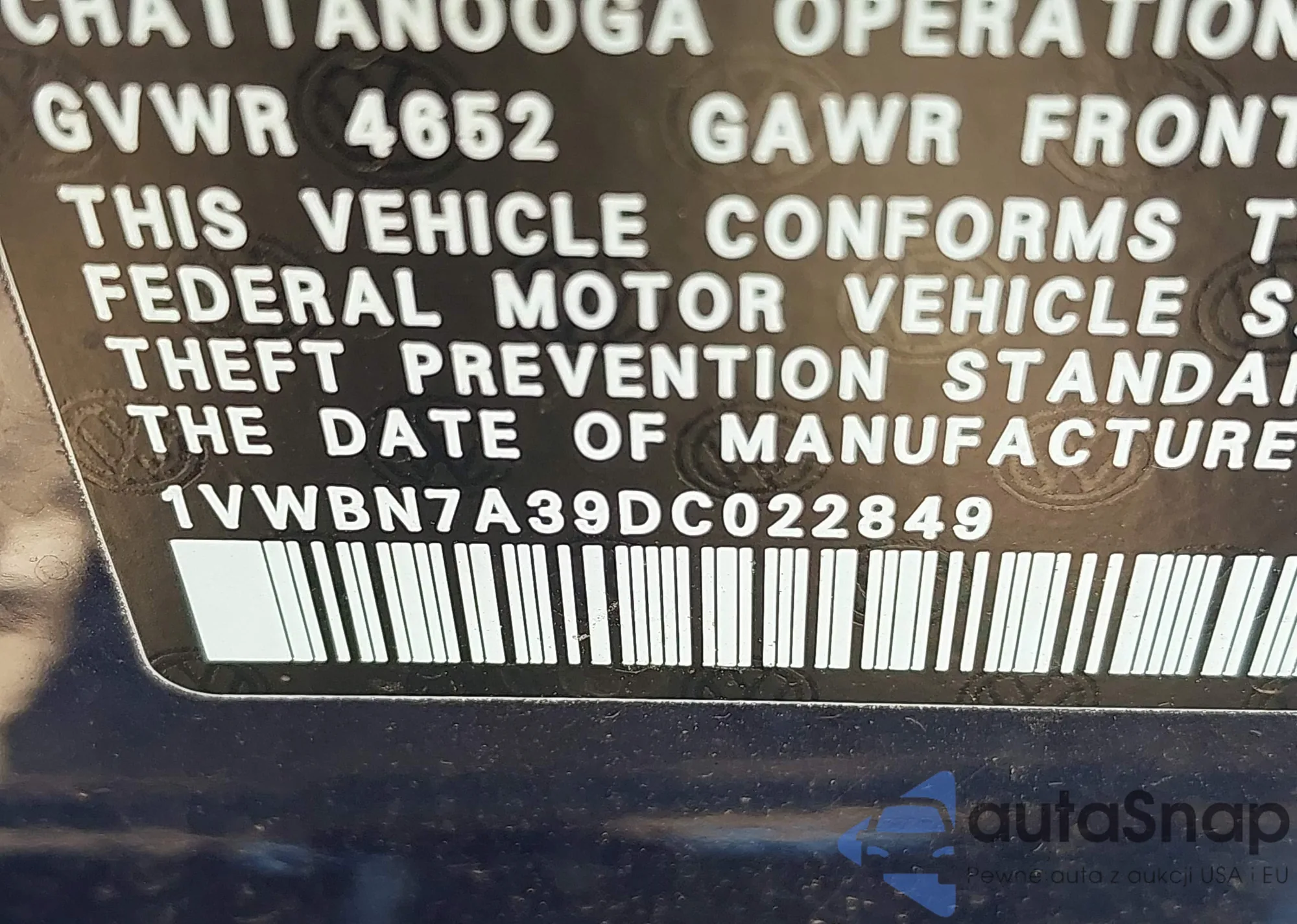 • VIN 1VWBN7A39DC022849