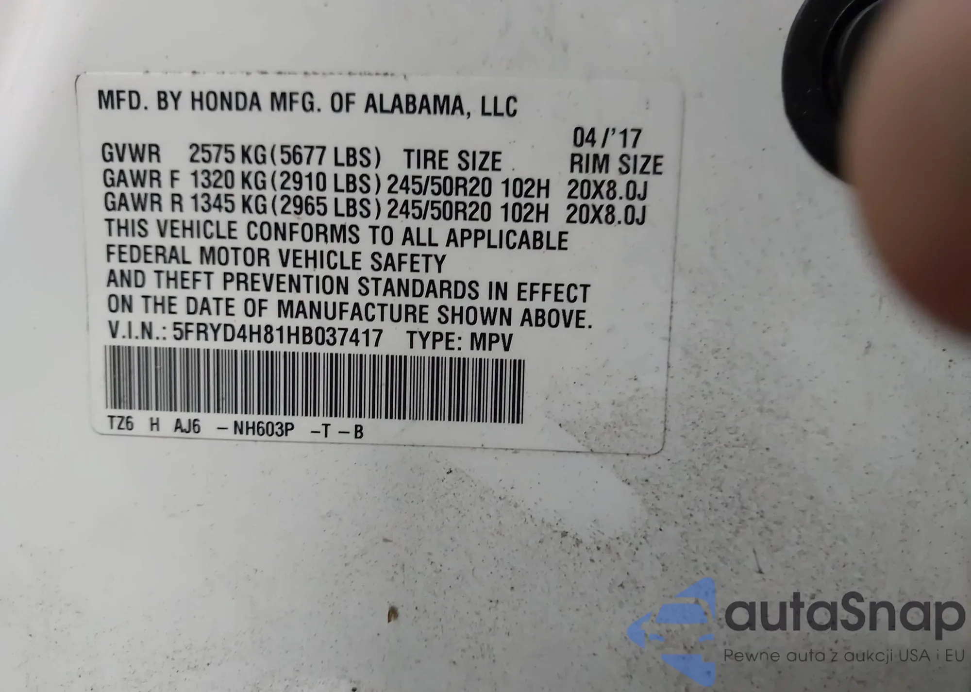 LOT: 42449003 VIN: 5FRYD4H81HB037417