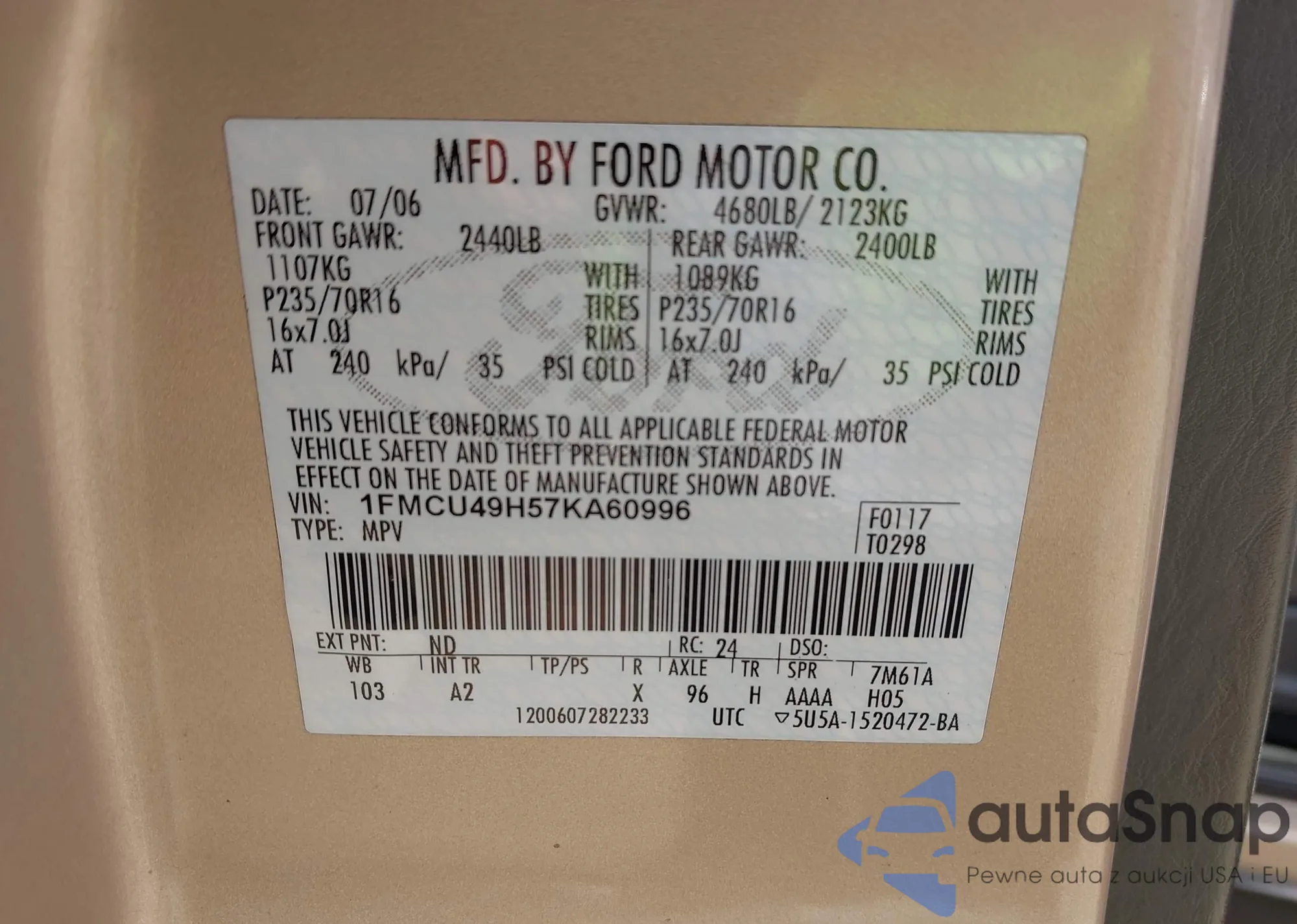• VIN 1FMCU49H57KA60996